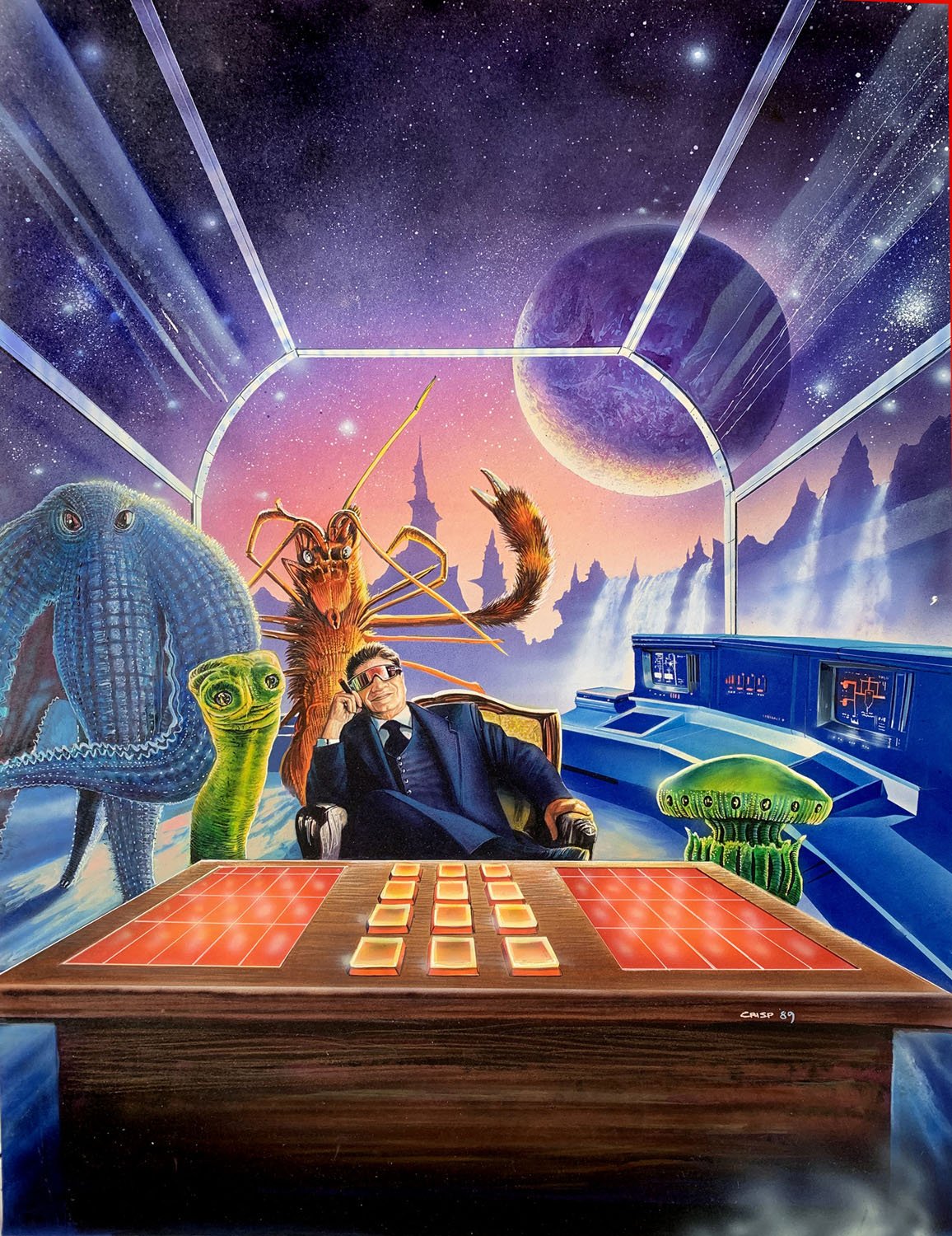 24 x 18 inches, acrylic on board. 1989. Cover for "Narabedla, Inc" by Frederick Pohl, Gollancz Publishers.