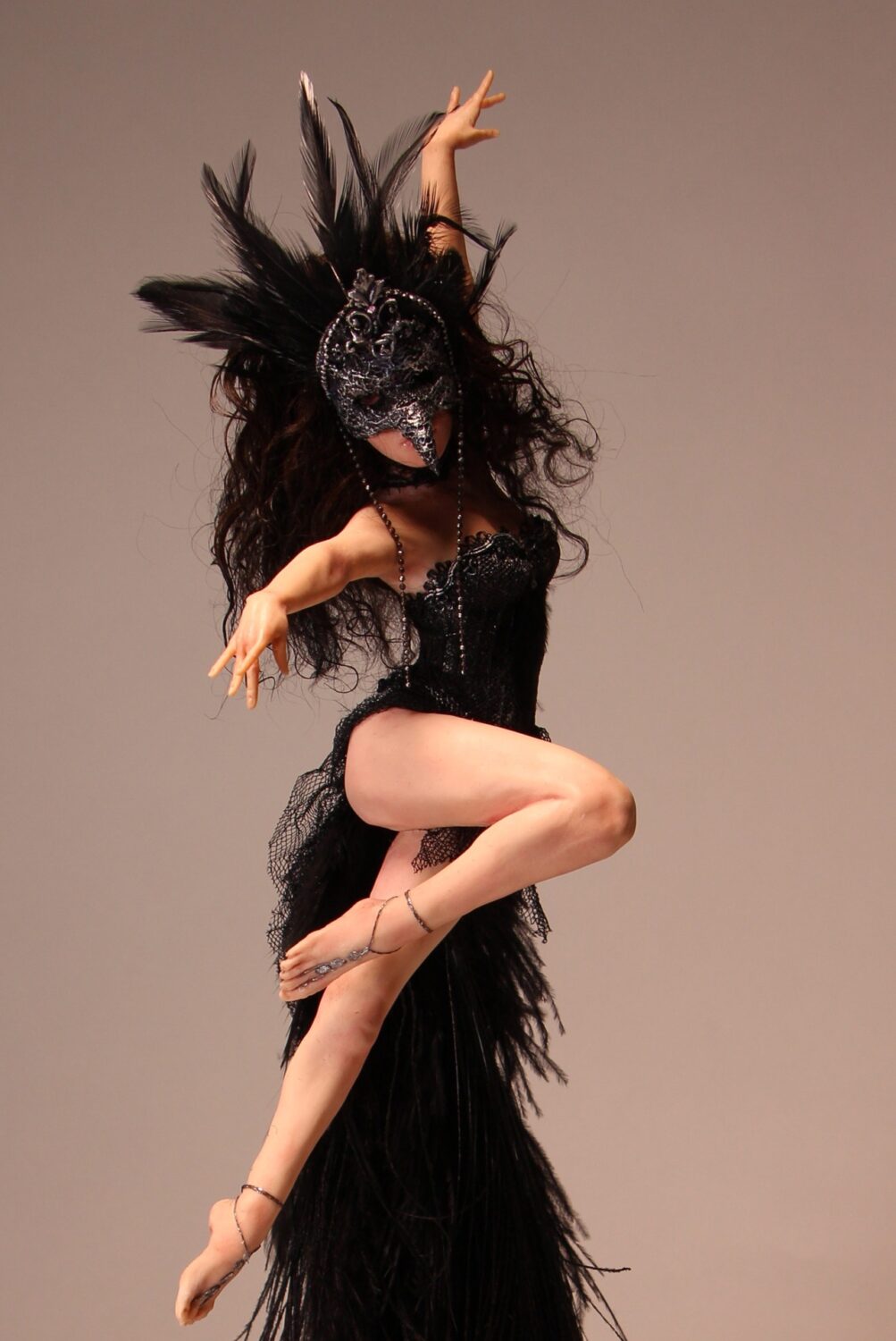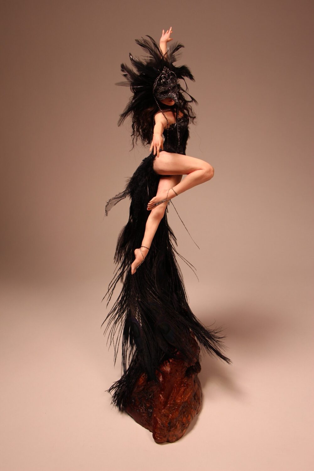 Noir is a hand-sculpted one-of-a-kind (OOAK) fantasy sculpture, made from polymer clay over a wire armature. The piece is mounted on Manzanita wood.The measurements are 19 x 7 inches. The size of the figure if standing would be about 11 inches (1/6 scale)