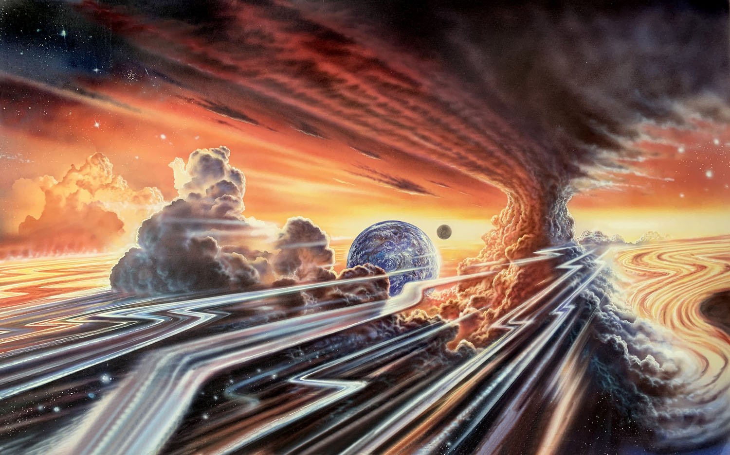 34 x 18 inches, acrylic on board. 1992. Cover for "Outnumbering the Dead" by Frederick Pohl, Century Publishers.