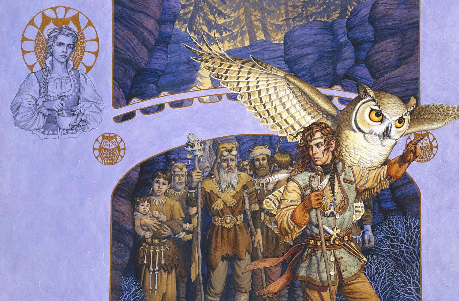 Acrylics, gold gouache, ink on board, 2/98, 18 x 27 inches, signed left of mother & child. The second book in the trilogy by Mercedes Lackey and Larry Dixon. Darian and Kuari his bond bird lead the barbarians to safety. The theme I got from the books was about building bridges to the many different cultures and peoples, and so the design has a bridge shaped frame/background. My son and I modeled for the mother and child on the left of the barbarian tribe. I think this is the only time I put a recognizable version of the two of us on a cover. For the first book I used some model in a one-page ad for Darian, foolishly thinking that this was going to be a standalone book. So, I was a bit pressed to make two more versions of this Darian for books two and three.