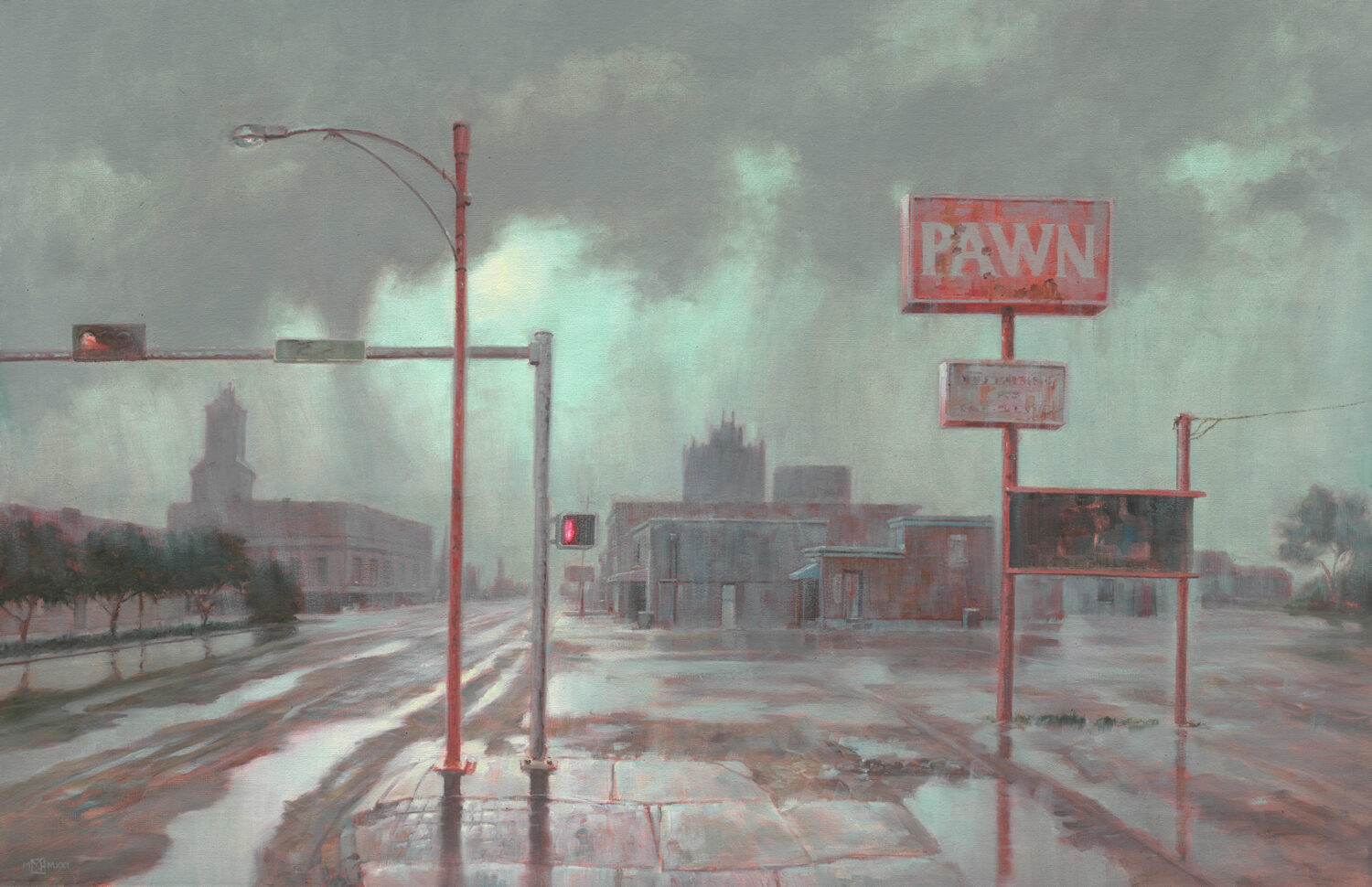 One of an ongoing series called "Roadside America", this one of a seemingly deserted small town in Texas under a rain storm. Where is everybody? Has something terrible happened?