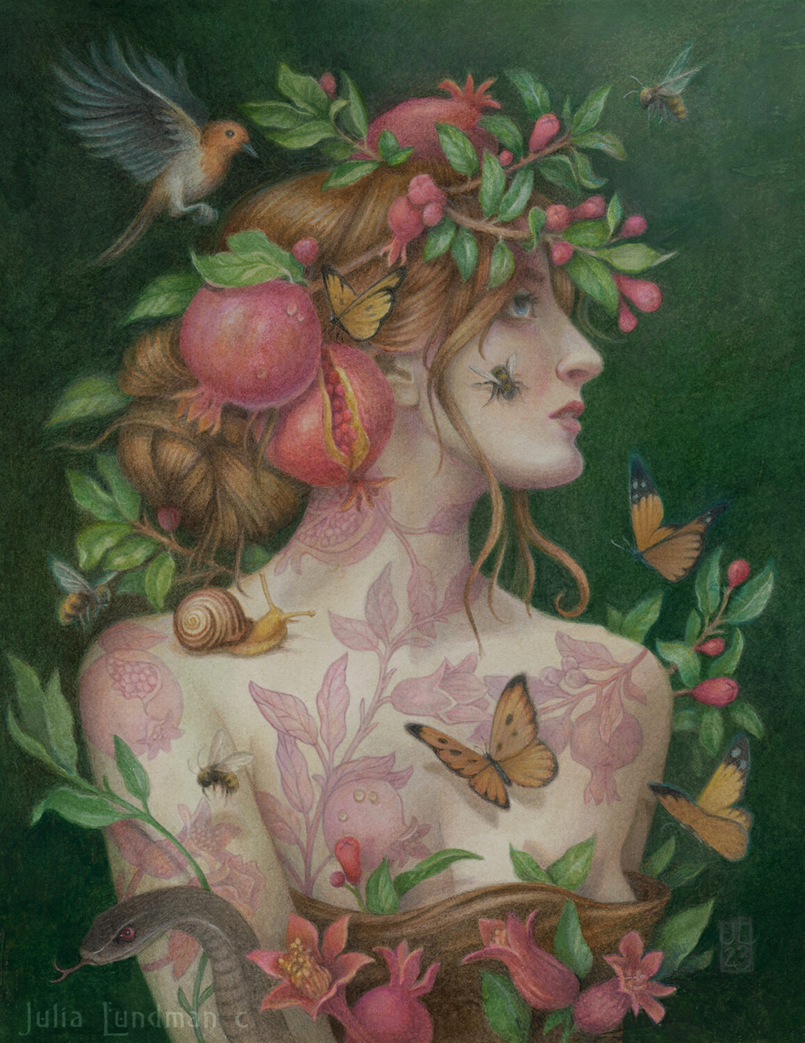The story of Persephone is one of trauma and adversity, as she was abducted and forced to live part of the year with Hades. Yet, she is also able to live free in the world at least part of the time, escaping her fate, creating growth and abundance out of her experience. I think the story of Persephone is a beautiful depiction of overcoming, or attempting to overcome terrible trauma, continuing to live with the scars and make a life meaningful.