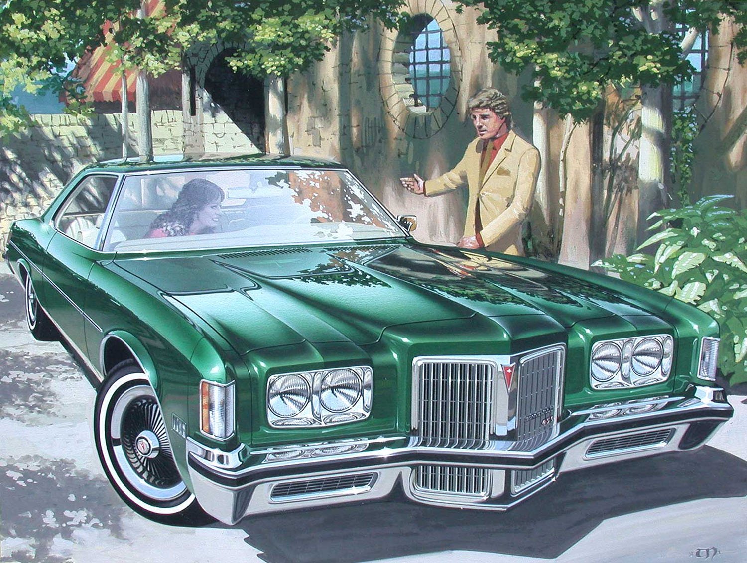 14 x 10.5 inches, gouache on board. Part of a personal series "in tribute to the golden age of automotive illustration. Some of these (mostly) 1970s works were ideas for creating faux ads, as if the 'Pontiac artists' Art Fitzpatrick and Van Kaufman continued their ads into the 70s. 1971 was the last year that the duo were employed on the Pontiac ads and brochures."