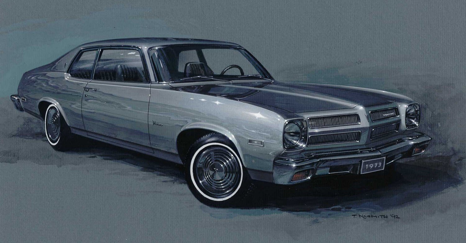 12.5 x 6.25 inches, b&w gouache on matt board. Part of a personal series "in tribute to the golden age of automotive illustration. Some of these (mostly) 1970s works were ideas for creating faux ads, as if the 'Pontiac artists' Art Fitzpatrick and Van Kaufman continued their ads into the 70s. 1971 was the last year that the duo were employed on the Pontiac ads and brochures."