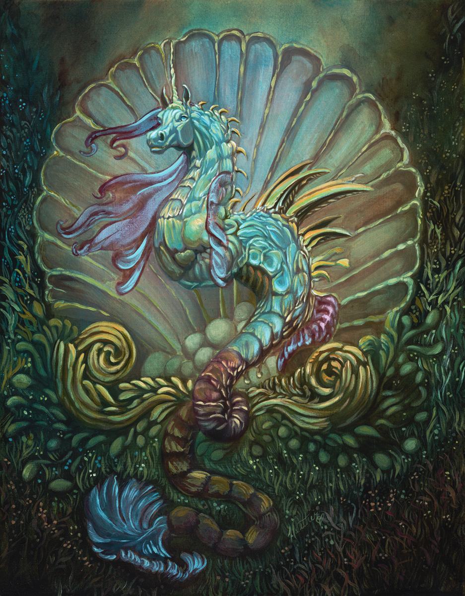 A realization of the god Poseidon't great gift to man, the horse, in it's water form. Only in this version, the creature is a unicorn.