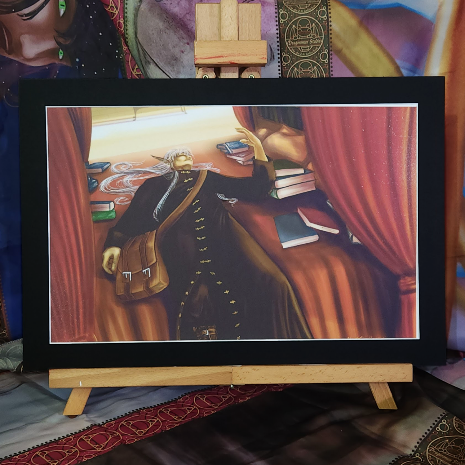 Illustration of the below scene from Sivoa: Sunrise (worldofsivoa.com):Completely over dealing with the two of them, Flag teleported back to his apartment. There he flopped between the stacks of books that he had forgotten to clear off the bed. He didn't bother removing the satchel that he had been hauling and left it draped across his torso. The ordeal with the king had drained whatever lingering energy he had left over from his trip.