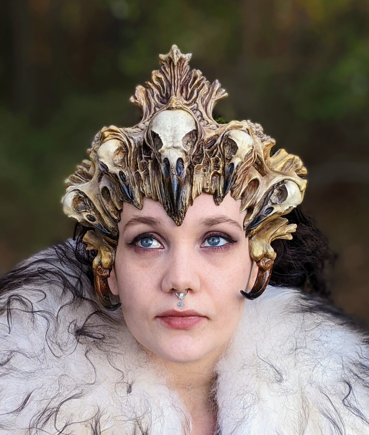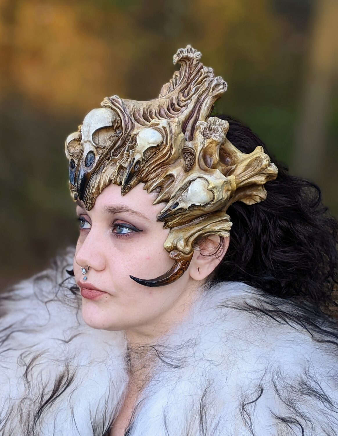 I sculpted this piece to explore and showcase the magnificent shapes and elegance of bones and skulls. I wanted an elegant but powerful looking piece that would look good with a variety of costume types and be something that could be worn at many different events.