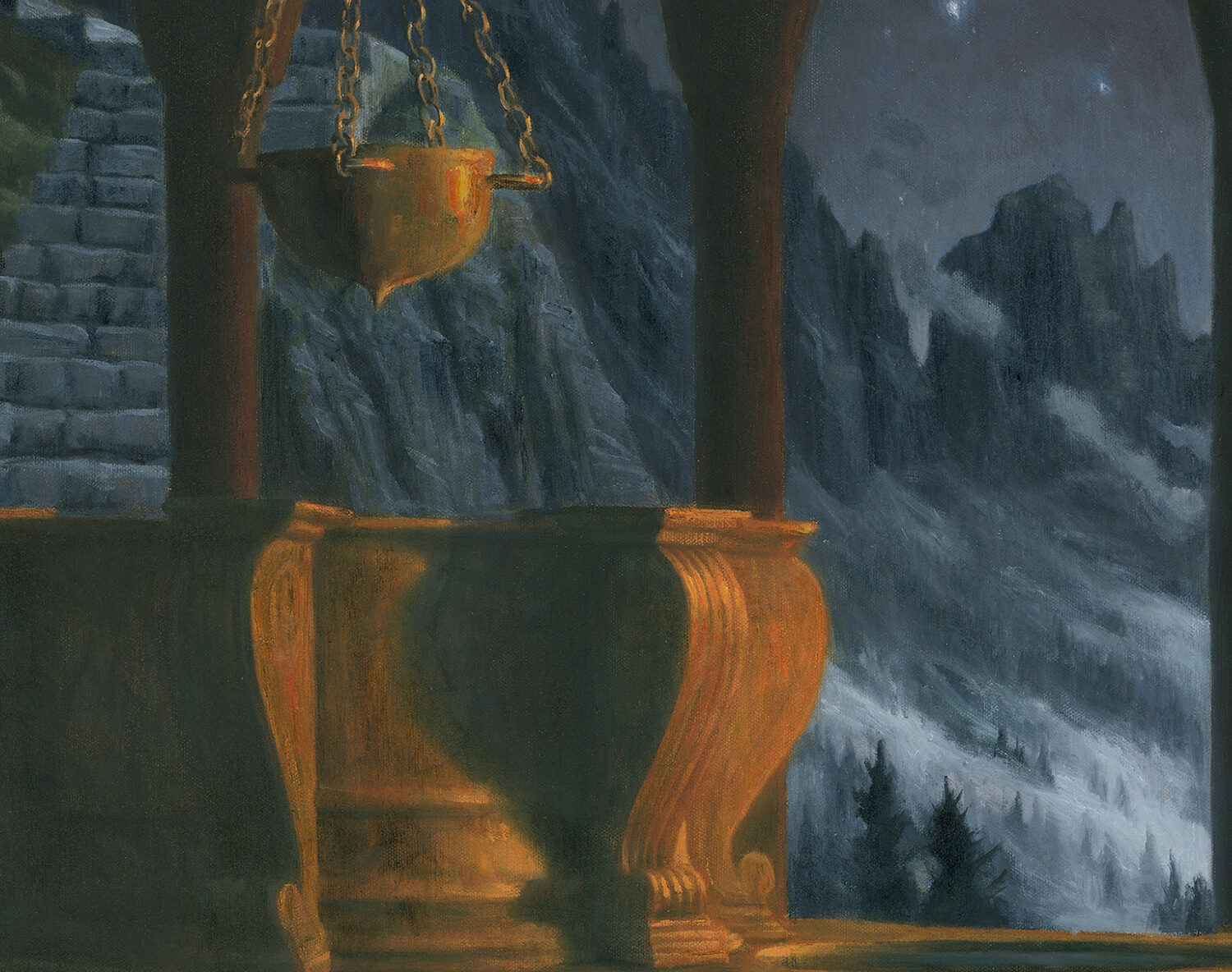A lunar/solar disk is held up to the red moon of a lunar eclipse. A lunar eclipse, a mountain temple, a sacred night...The floor design is a replica of the Nebra Sky disk which is a 3500 year old bronze disk found in Germany. On it are represented phases of the moon, the sun, the Pleiades, stars and an indication of the solstices. It is the oldest known depiction of the cosmos found. In my painting it represents our connection with the sun, moon, cycles of nature as well as with our ancestors.