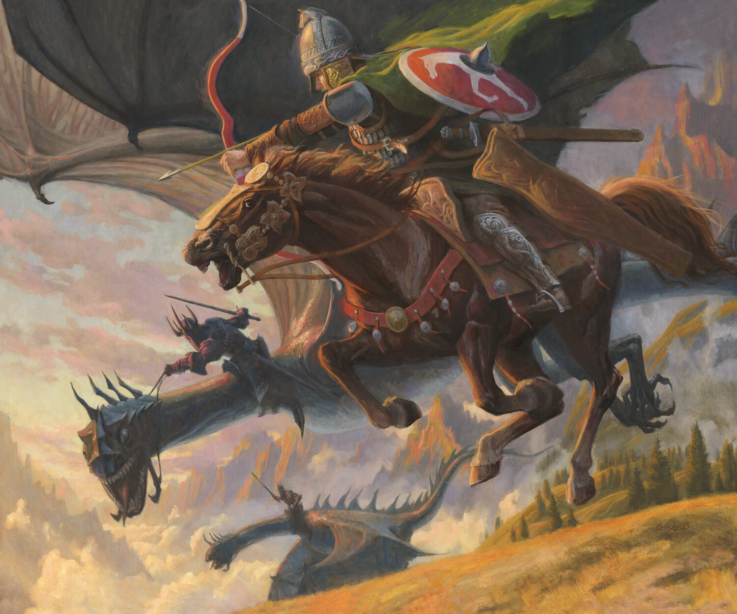 The Rohirrim must constantly patrol their borders to keep a careful watch for orcs, or those in service of Sauron. In the open highlands of Rohan, a rider on patrol is set upon by Ringwraiths. Galloping at full speed to catch up to the rest of his company he must use his arrows to fight off the doom that is close at hand. The Hithaeglir or Misty Mountains in the late rays of the day, provide the backdrop to this highspeed chase.