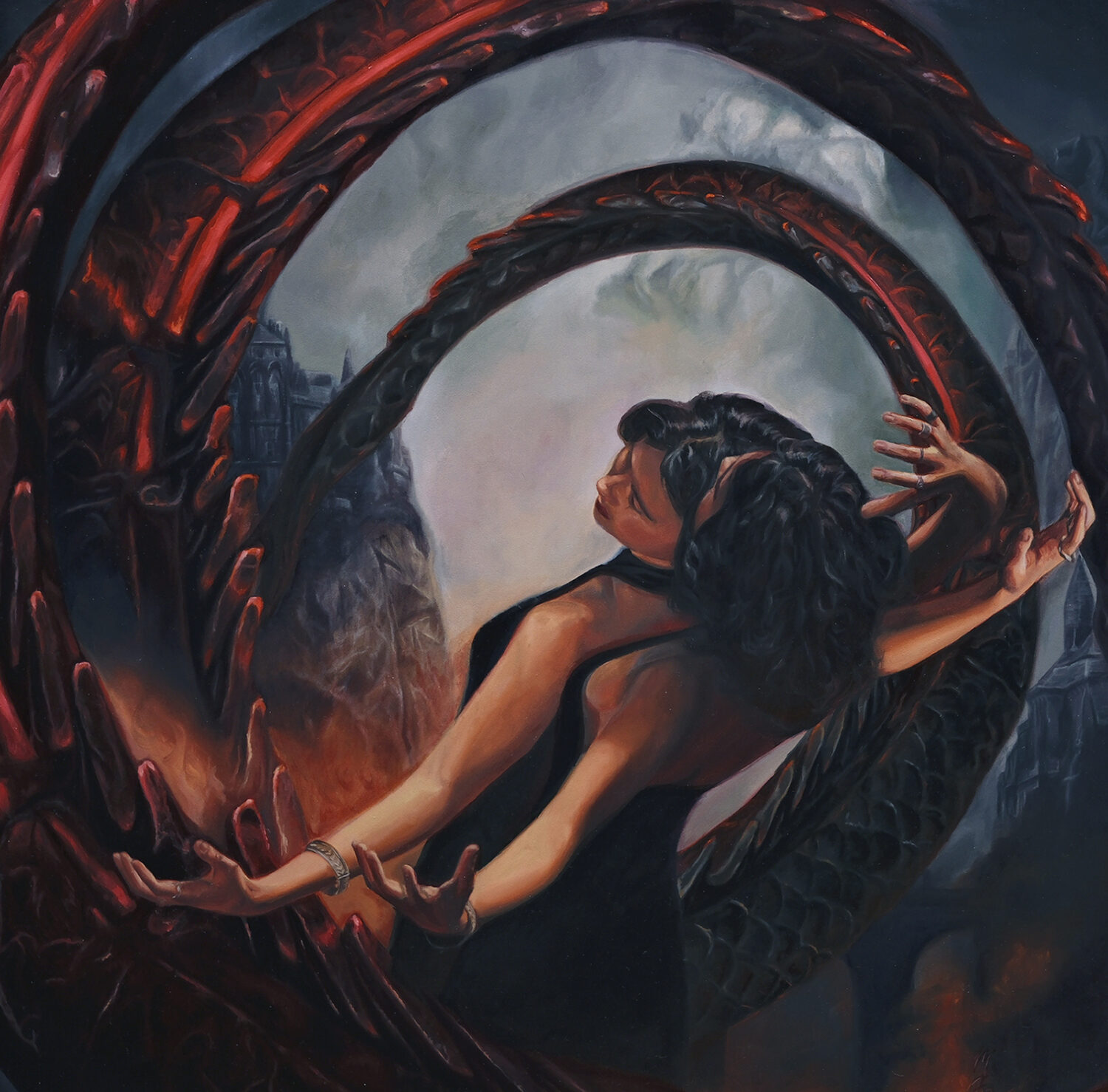 This painting has an intentionally ambiguous narrative. My title "Ritual" represents my personal take, where a young woman is summoning a great dragon and transcending the realm of reality into a magical one, which is why she is doubled. I enjoyed designing this piece with the concentric rings of the dragon and the wide variation in color for varying levels of the dragon's depth within the piece's environment.
