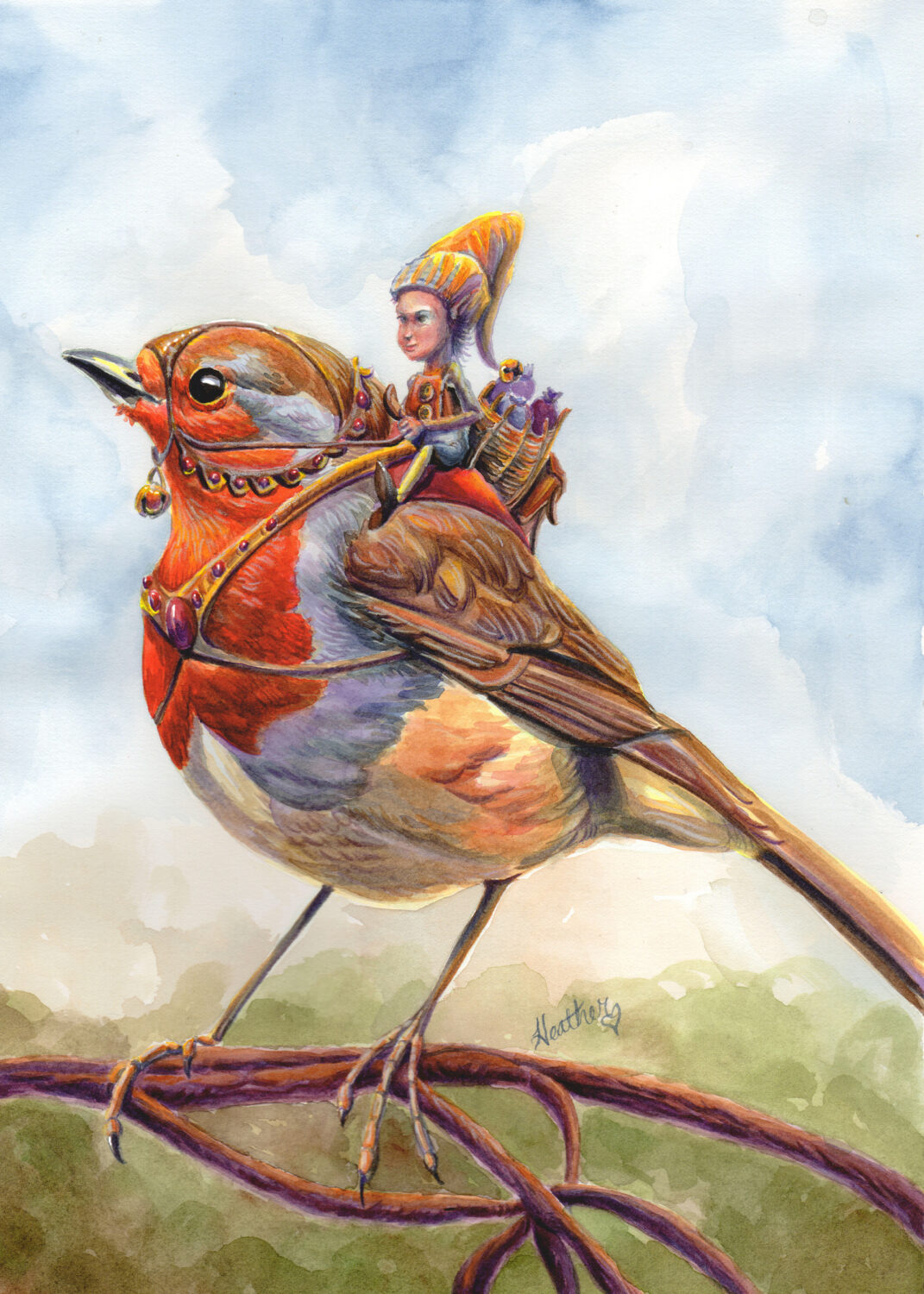 This little fairy and his robin friend gather food in the forest near their home. Watercolor on paper.