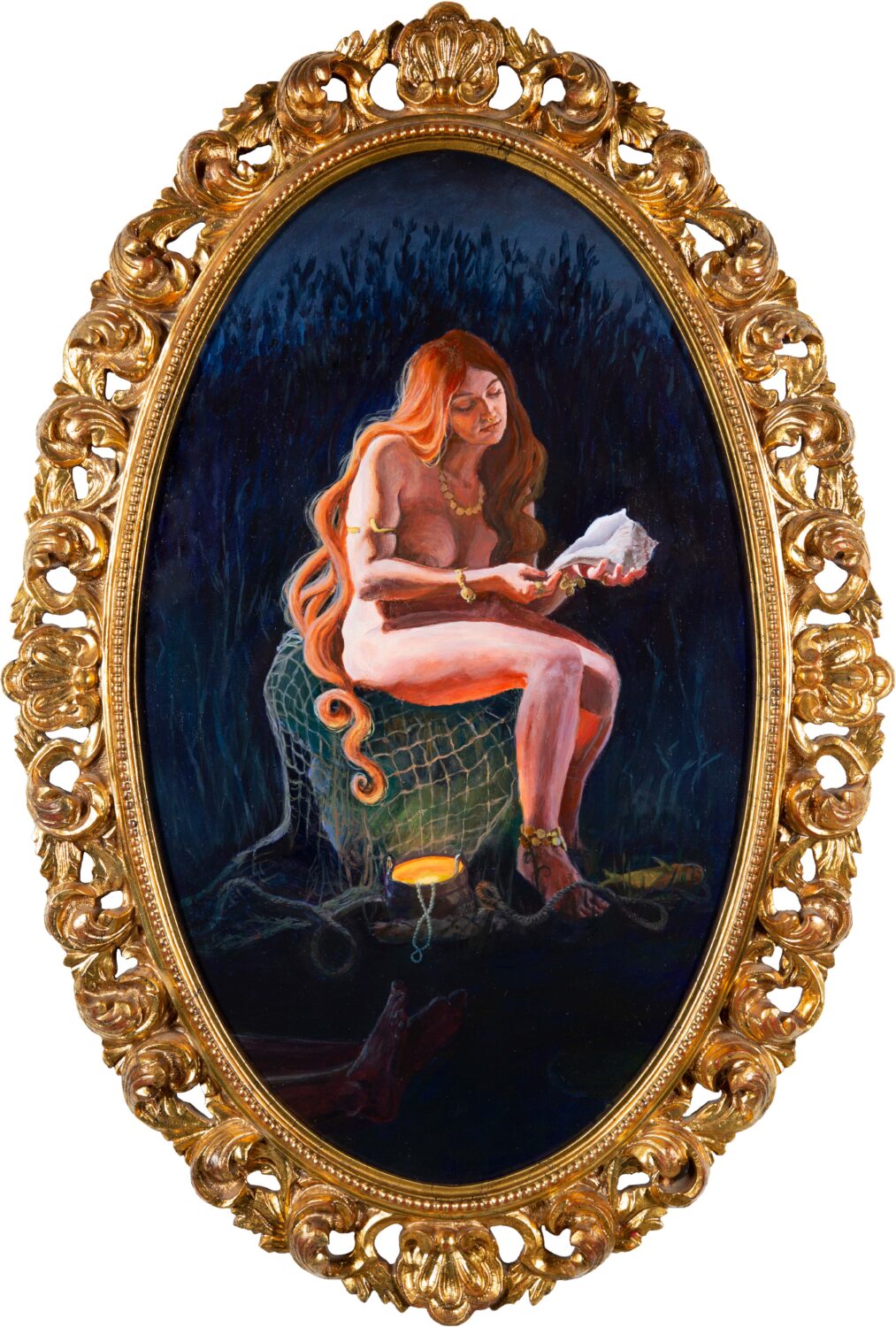 Rusalka is heavily inspired by the Pre-Raphaelites. The pose, subject, and lighting are my contemporary take on the Pre-Raphaelite movement. The subject, the rusalka, is a mythological creature from Slavic folklore. She appears near bodies of water as a beautiful woman who lures men to their deaths. In my version of the rusalka, she kills men because that's all she knows, and she collects the shiny objects that her victims leave behind. The rusalka is a femme fatale who does what she has to in order to survive.