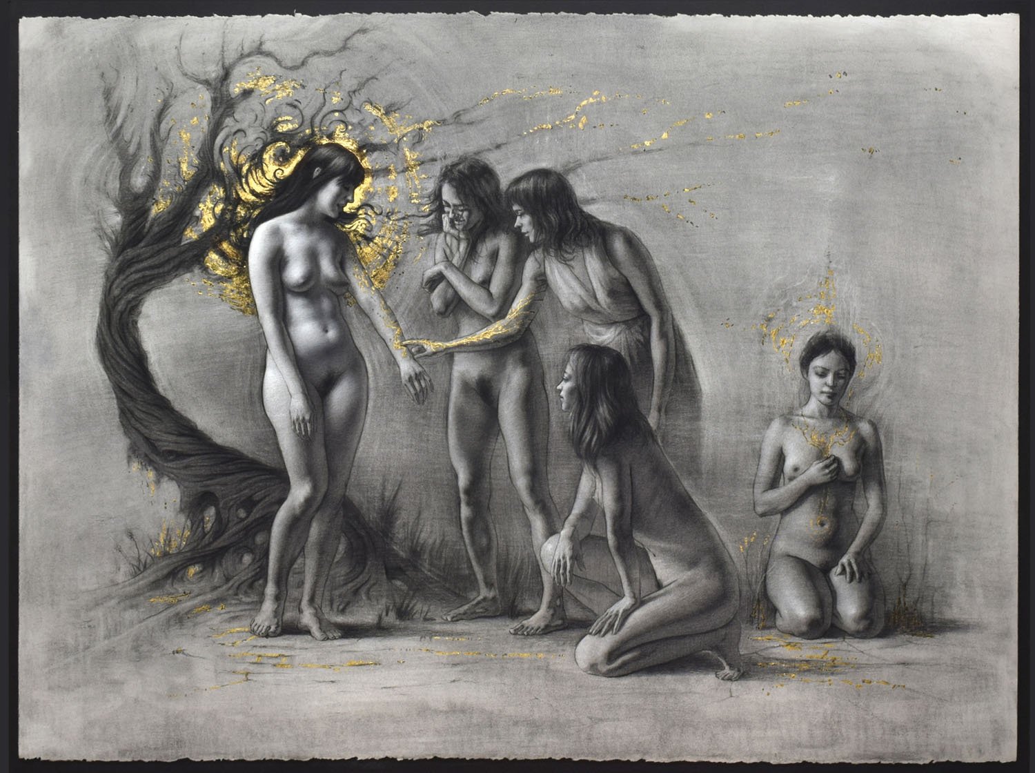 30 x 38 inches, charcoal, white pastel and 23k gold on paper. Framed.