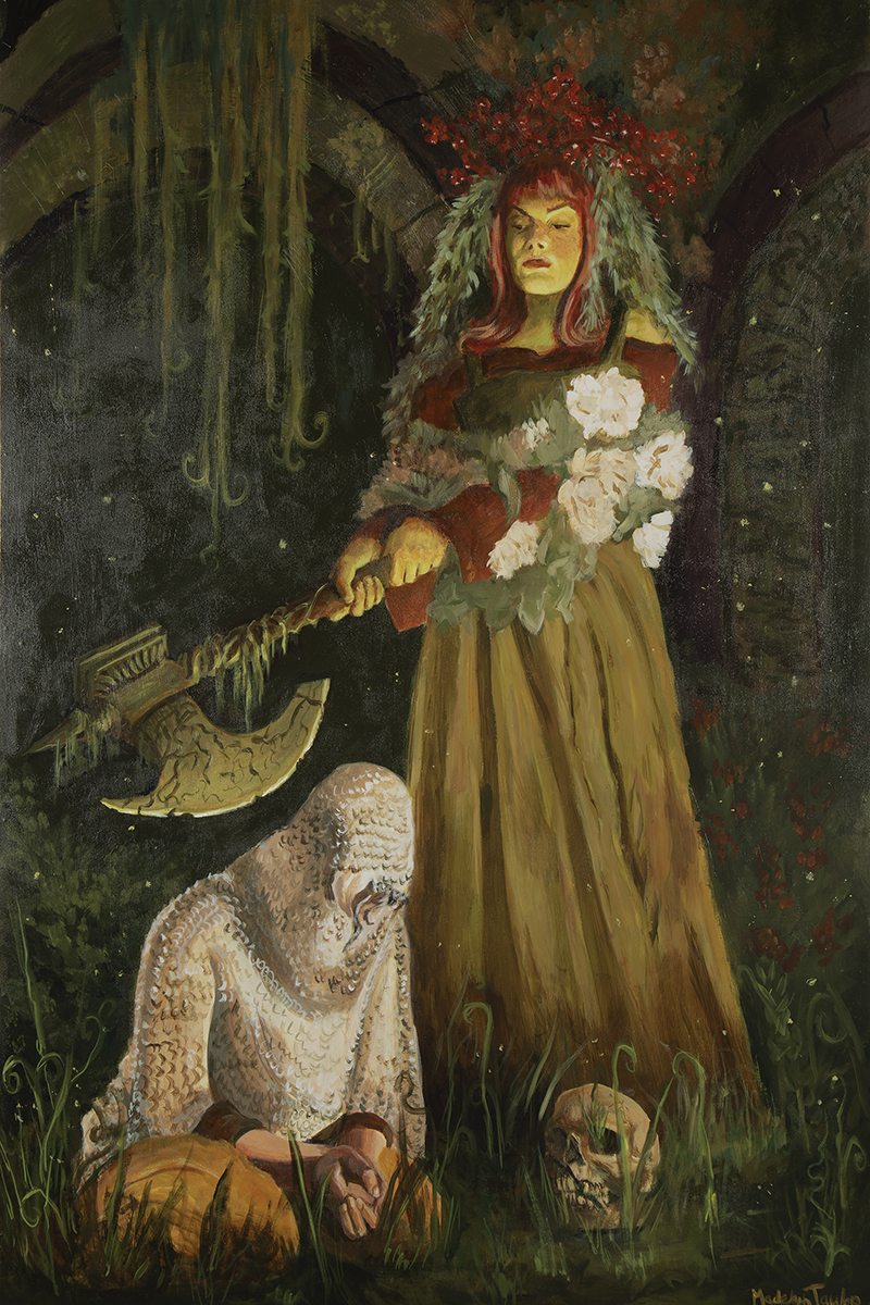 "Sir Gawain and the Green Knight" depicts the moment just before Gawain's head is chopped off. He is in a perpetual state of in-betweens - between losing his head and keeping it.