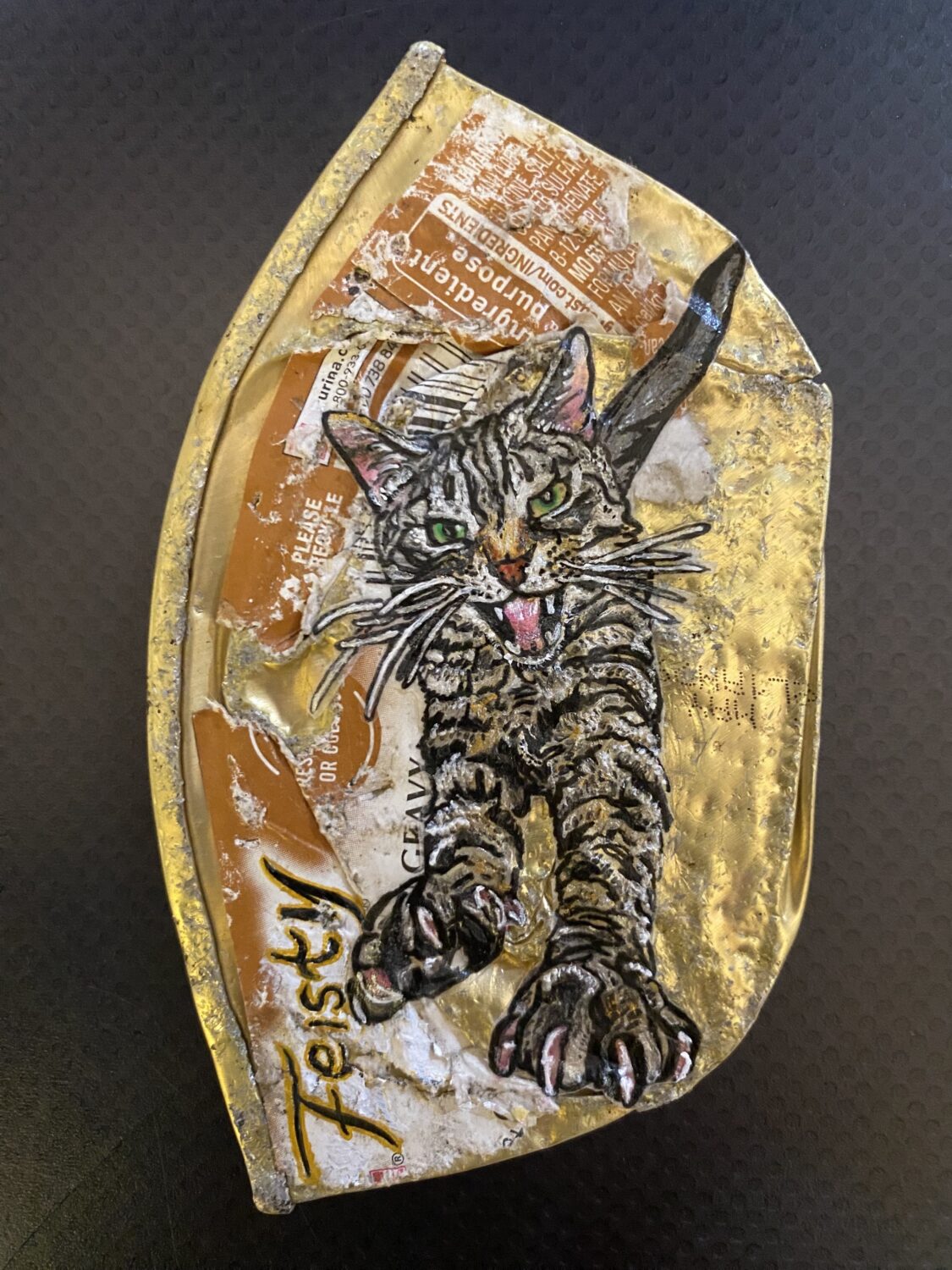Pet portrait on crushed Fancy Feast cat food can. I picked this can up from my neighborhood on trash day and wanted to portray a cat as the can's assailant at mealtime.