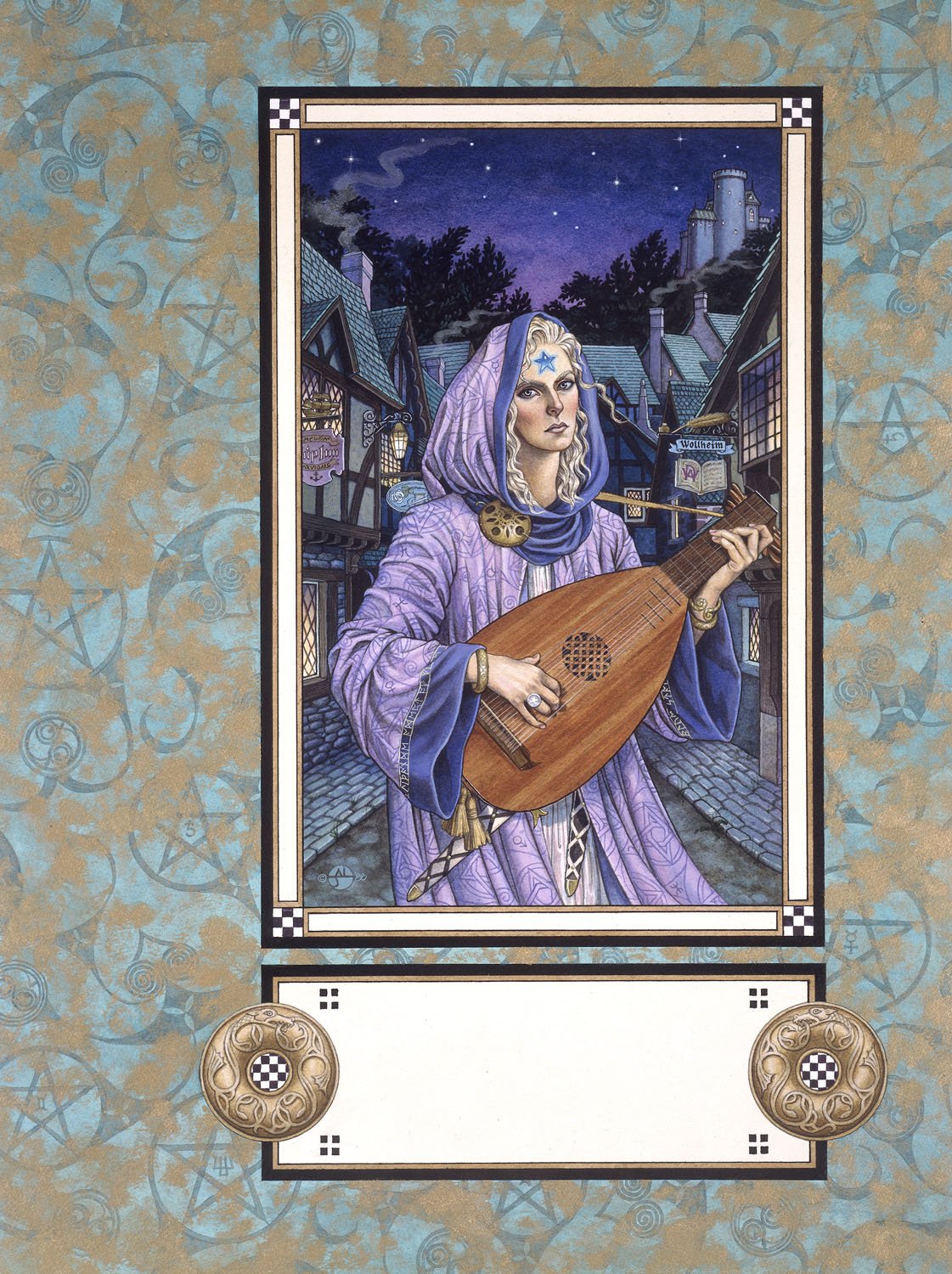 Acrylics, ink, gold gouache on board, 12/88, 26 x 18 inches, signed lower left. On the cover of this anthology is a well-known character in modern fantasy. Lythande must keep her sex a secret from all or bear the loss of her sorcerous powers, so her face is lonely, beautiful, androgynous. Her bracelet and brooch are jewelry I actually possess, while the runes on the sleeves of her robe say "Lythande, Adept of the Blue Star." One of the hanging shop signs advertises the publisher, DAW Books. The design has Celtic and Anglo-Saxon influences.