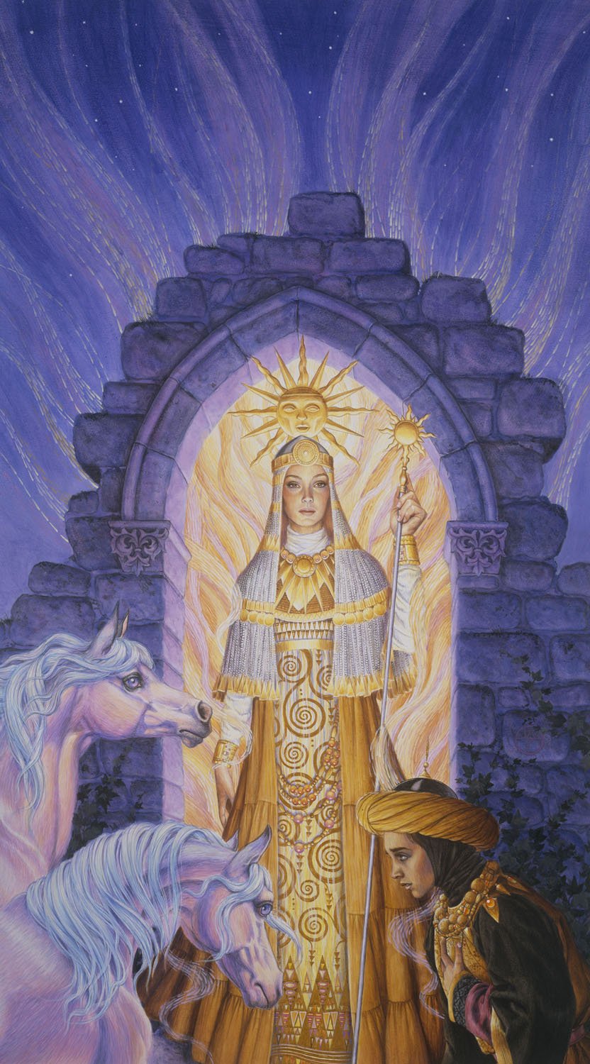 Acrylics, gold gouache on board, 2/95, 14 x 25 inches, signed on left wall. For the second book in Lackey’s Mage Storm Trilogy, I gave up and made separate art for the back and front of the book. This is the front, with the new ruler of Karse, Solaris, Son of the Sun, coming to magically visit Valdemar. Once again, I had recently seen a museum show about the Moche people of South America, and I incorporated quite a bit of that into the garb of the God-Priest Ruler of Karse. Not long after the book was published, I was invited to a convention in Iowa, and the organizer was costumed exquisitely as Solaris! The art for the back of the book, of the Sun Cat, hangs in my mother’s house.