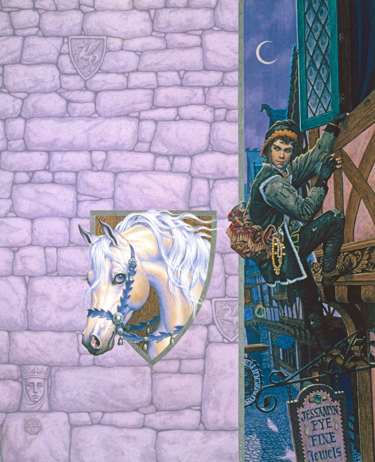 Acrylics on board, 4/01, 22 x 18 inches, signed lower left. For the novel by Mercedes Lackey. I really like this cover, even though the cut in half design is odd; I was searching for a different, unusual look. The details are really nice, in the rock wall, the puddles in the cobbled street, the moonlit edges from behind. I put my daughter’s name on the jeweler’s sign, and my son’s name on the one beside it with a snake – at five he was really into reptiles.