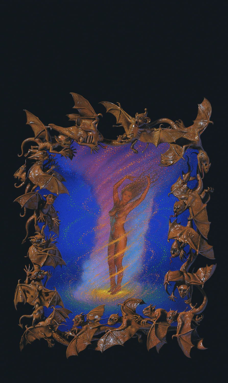 9 15/16 x 16 7/16 inches, gouache on board. 1989. Cover for the novel by Piers Anthony. Also the cover to Tim's third art book, "Mirror of Dreams."
