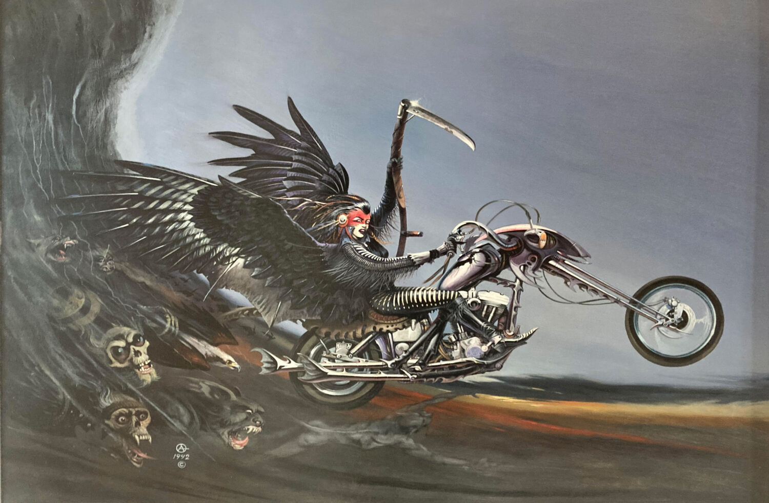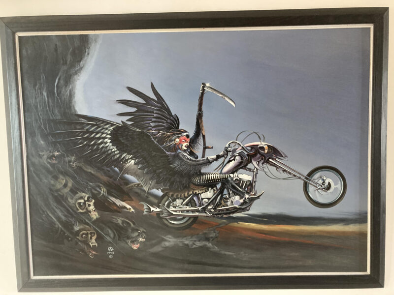 Classic and very large image by Chris Achilleos - this piece was originally created for a biker magazine and was then used as the box topper wrapper in Chris's card set as well as being produced as a poster. It is framed and ships from the UK.