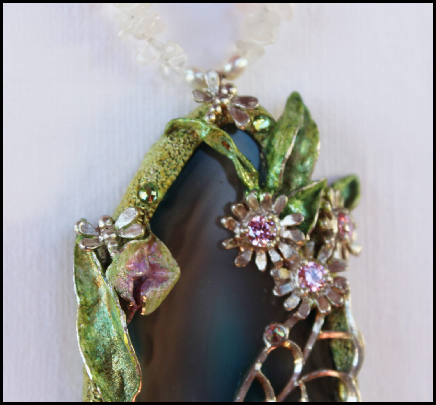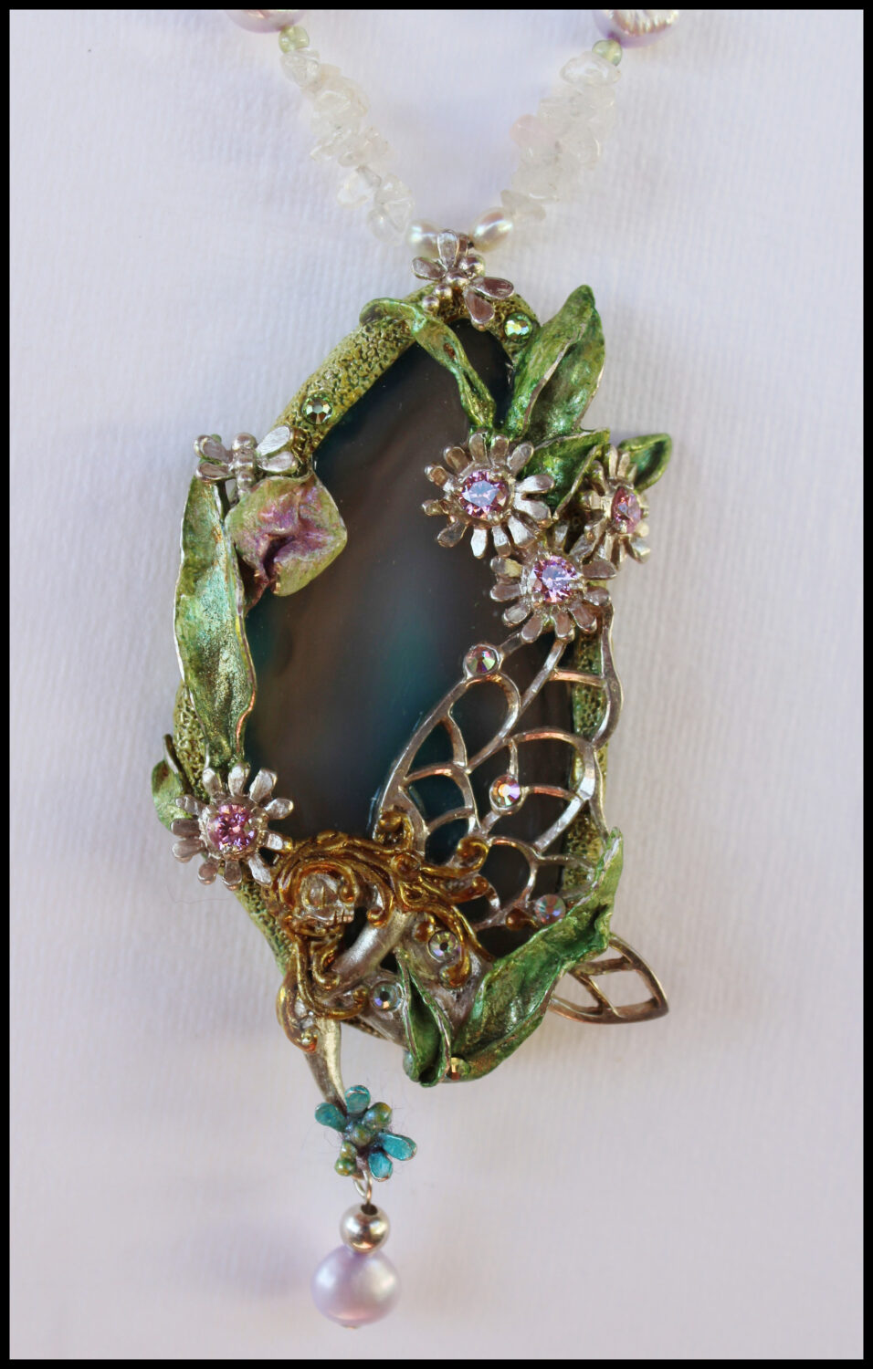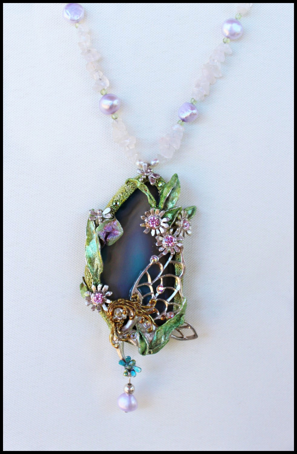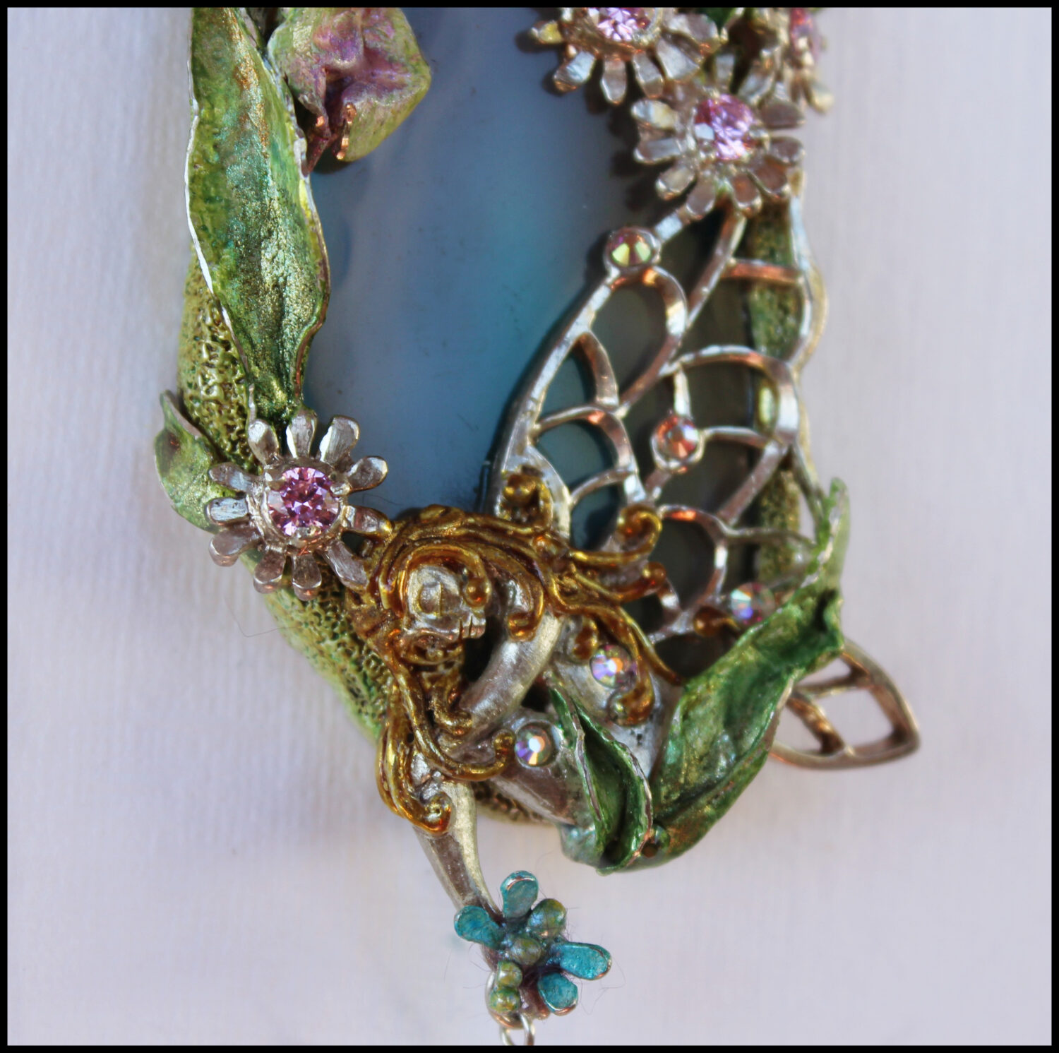 The Faerie sleeps in her sweet flower filled bower, a bed fit for a queen that overhangs a cool blue pool, and is strewn with delicate coloured pretties and sparklesThis is a Silver piece with mixed gemstones and enamels