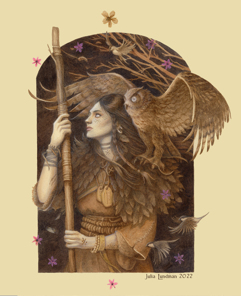 My vision of a mesolithic woman embarking on a journey into the unknown with her owl companion. They are the forsaken, cast outs from their tribe.