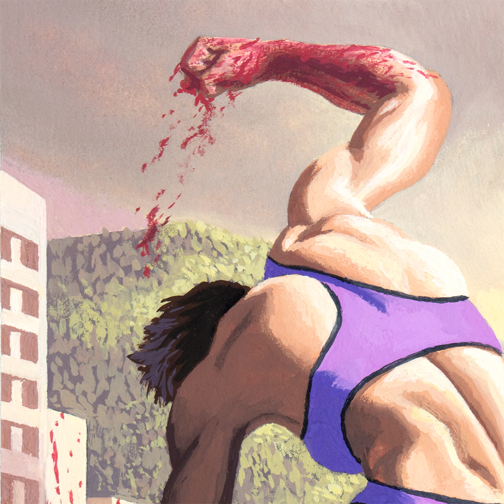 The brawl between the woman and monster spilled across the mountainside, topography reshaped in its wake. The crustaceous abomination, as much a man as it was a crab, shrugged off Melinda's blows easily, and it proceeded with dogged determination towards the city proper. The more urgent the situation became, the more Melinda's hatred for the thing grew.With high-rise buildings in arms’ reach, Melinda switched tactics. Ducked under a swinging claw, lunged forward at the creature's legs. It slammed into the earth, and like a feral dog, Melinda advanced over the spiked armor to get at its throat.