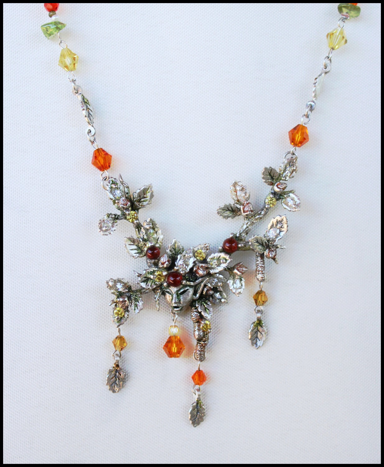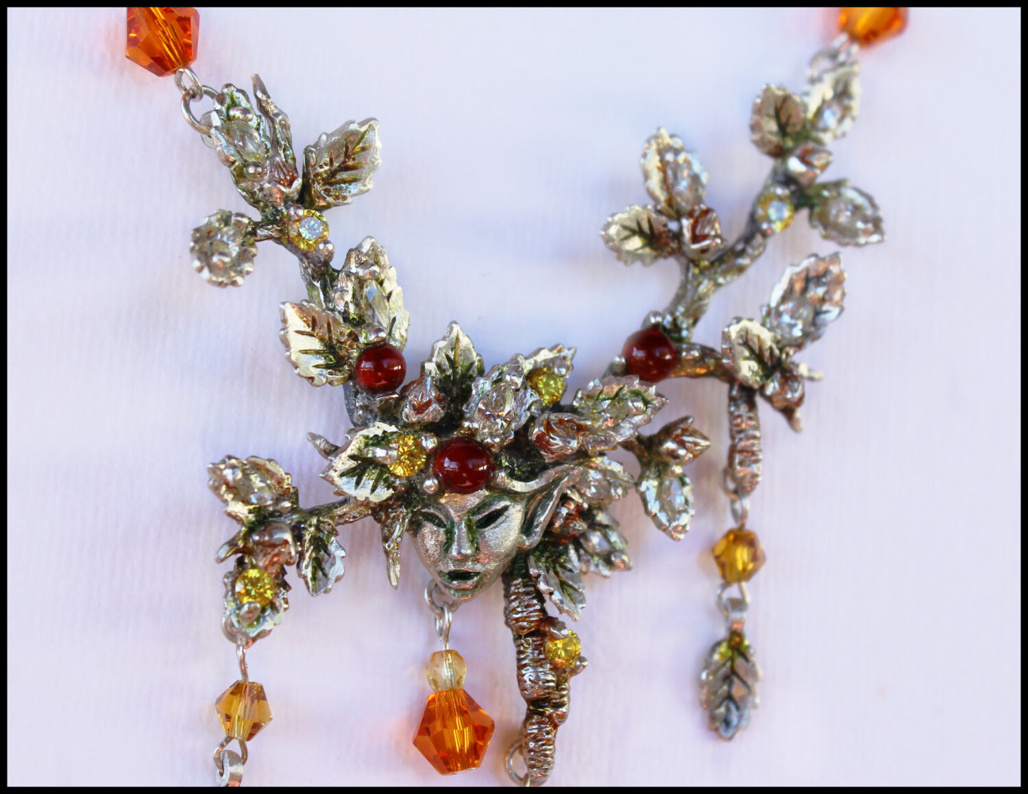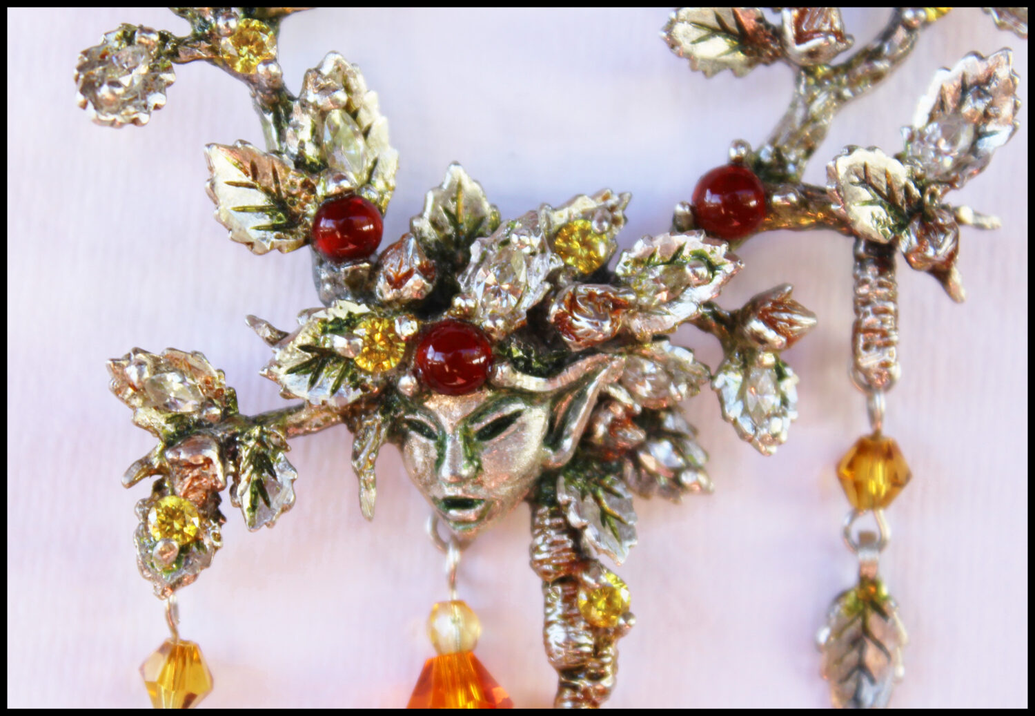 The Hazel Dryad, a dainty thing, but powerful. She feeds her magical energy into the trees and roots and branches... encouraging the trees to grow, to send out shoots and grow sweet, ripe nuts and pretty delicate catkinsThis is a Silver piece with mixed gemstones and enamels