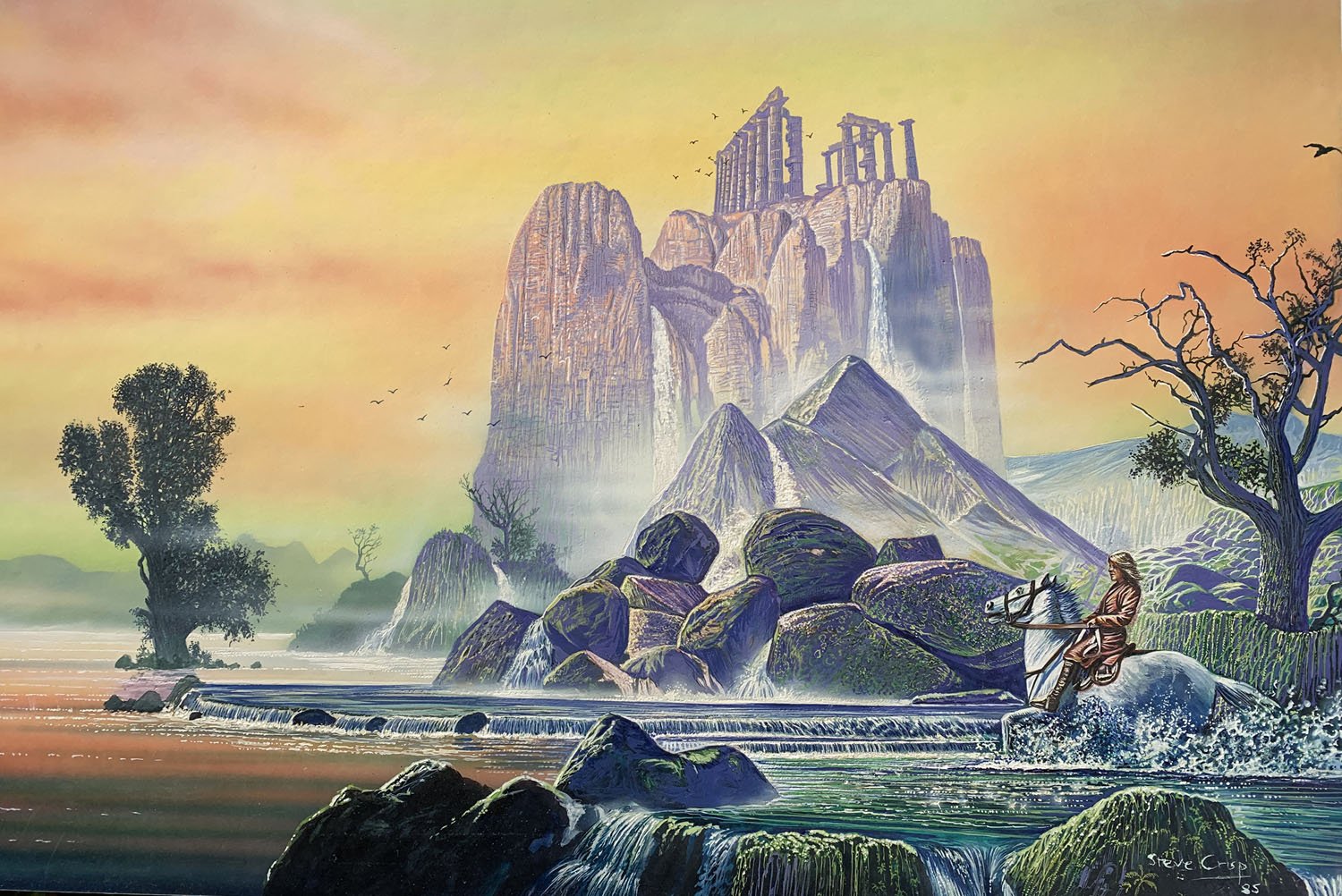 28 x 18 inches, acrylic on board. 1988. Cover for "The Hounds of God" (The Hound and the Falcoln Trilogy Volume 3) by Judith Tarr, Corgi Books.