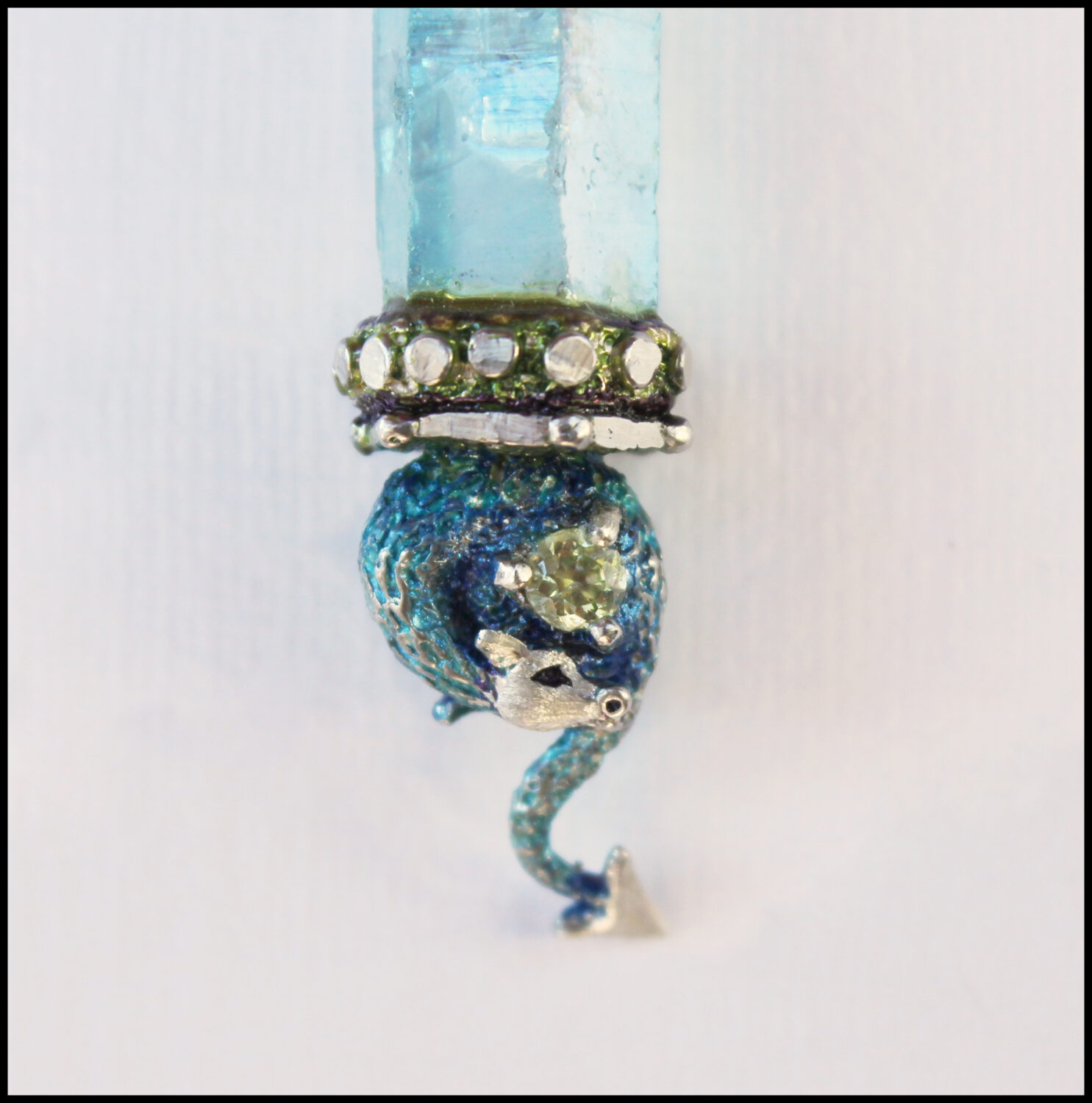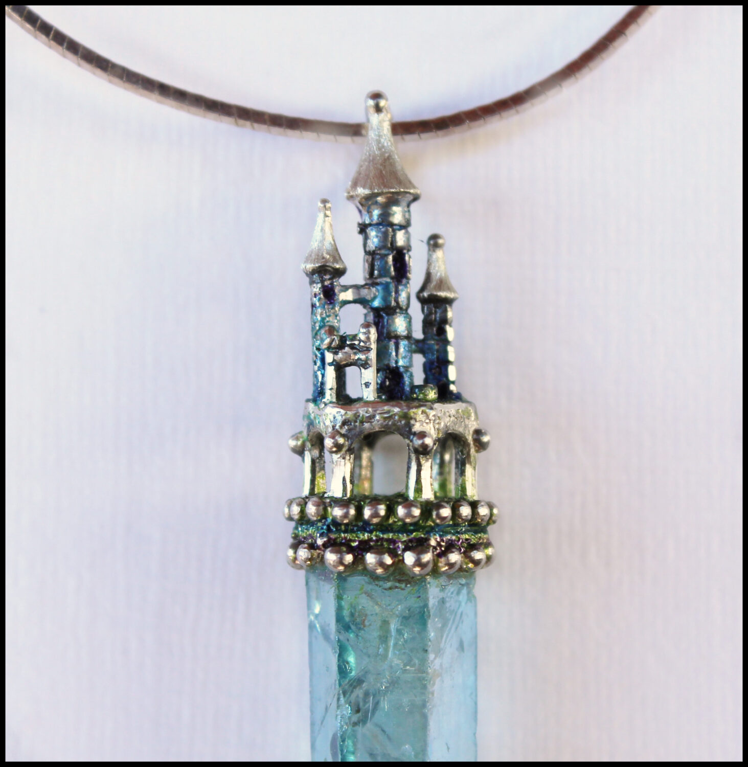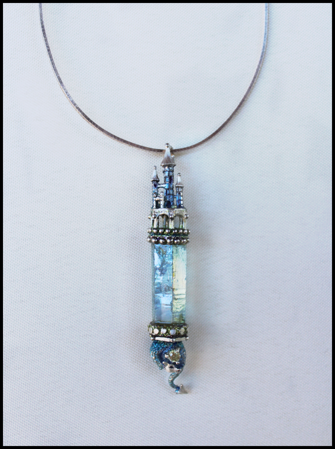 Atop a crystalline lake sits a tiny keep, a castle full of promise... and beneath the lake is curled a tiny dragon, watching and protectingThis piece is Silver with mixed gemstones and enamels