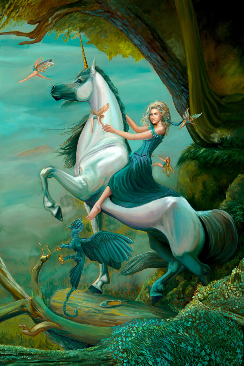 Often a girl must free herself from the constraints put on her by society and find the courage to leap off the edge and follow her own dreams. Here the fairies help her remove some of those things expected of her by others and her dream is a unicorn about to leap off the edge into the unknown destinies of her life.