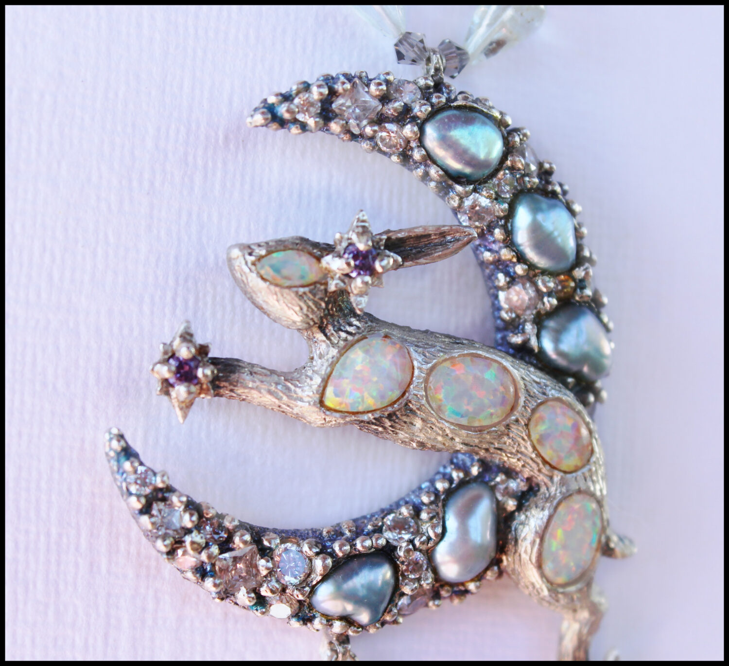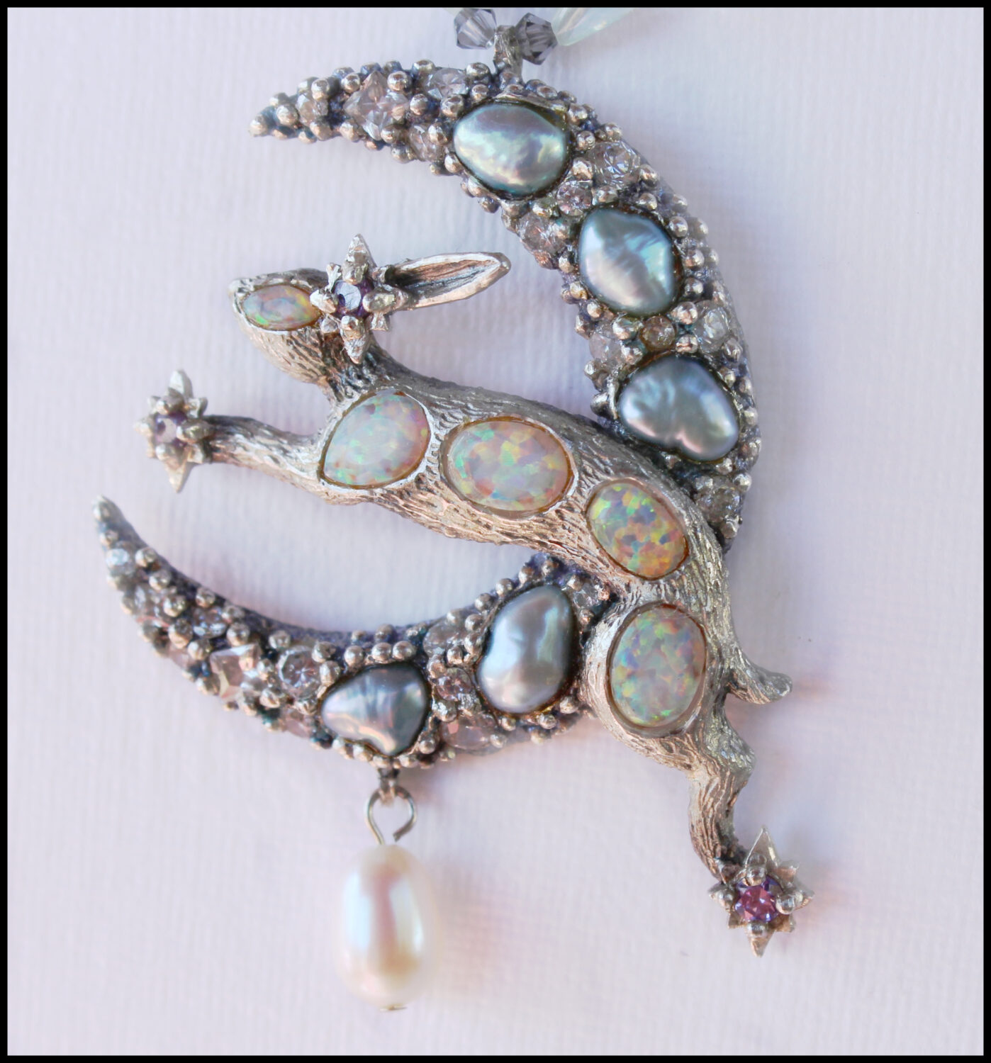 A beautiful moon hare, leaping high into the skies. She shimmers as she jumps and disappears into the moonbeams!This is a Silver piece with mixed gemstones and enamels