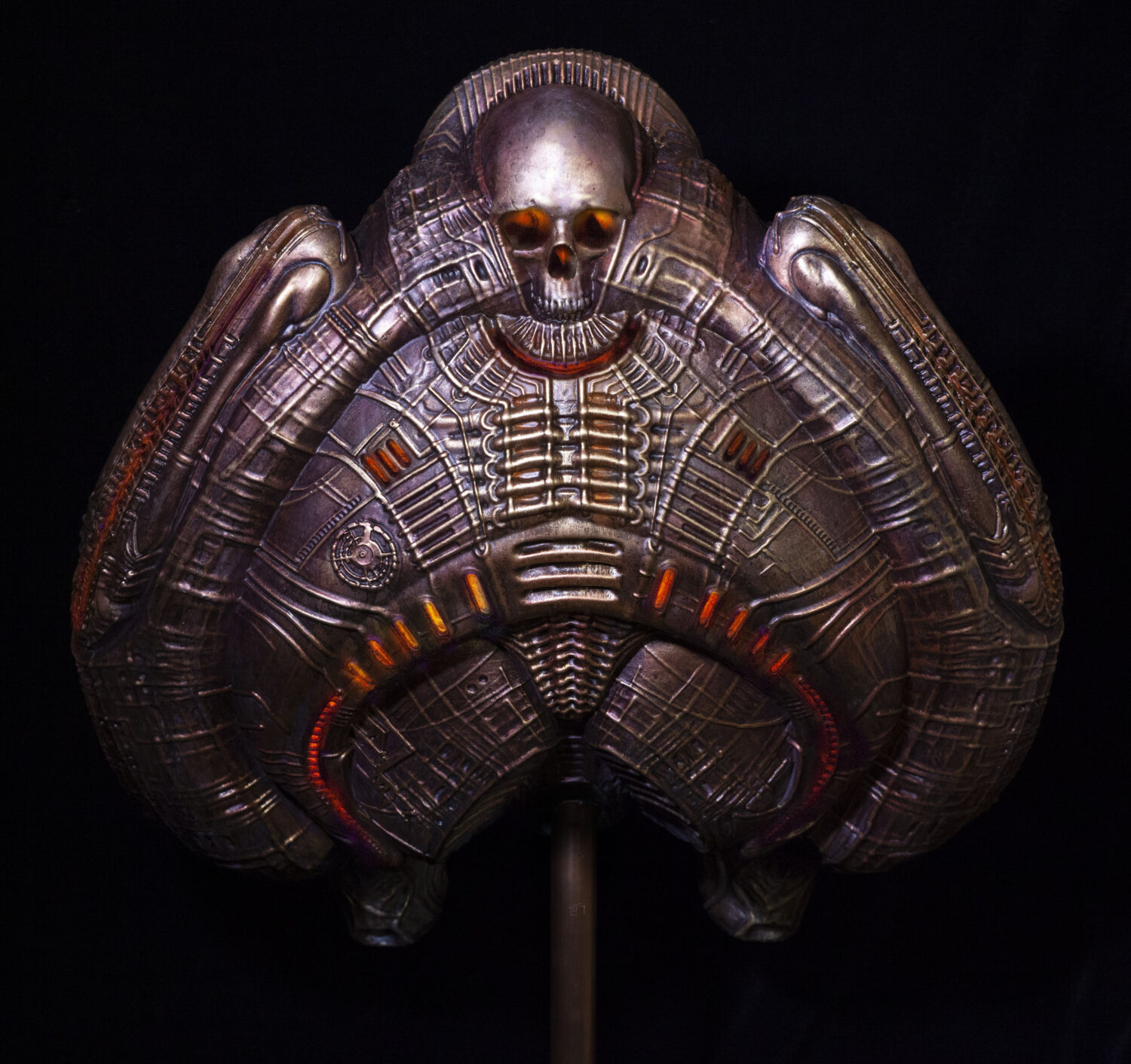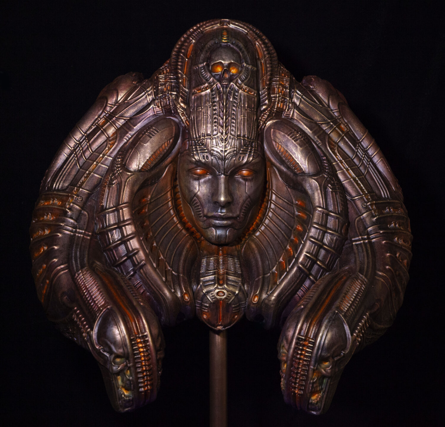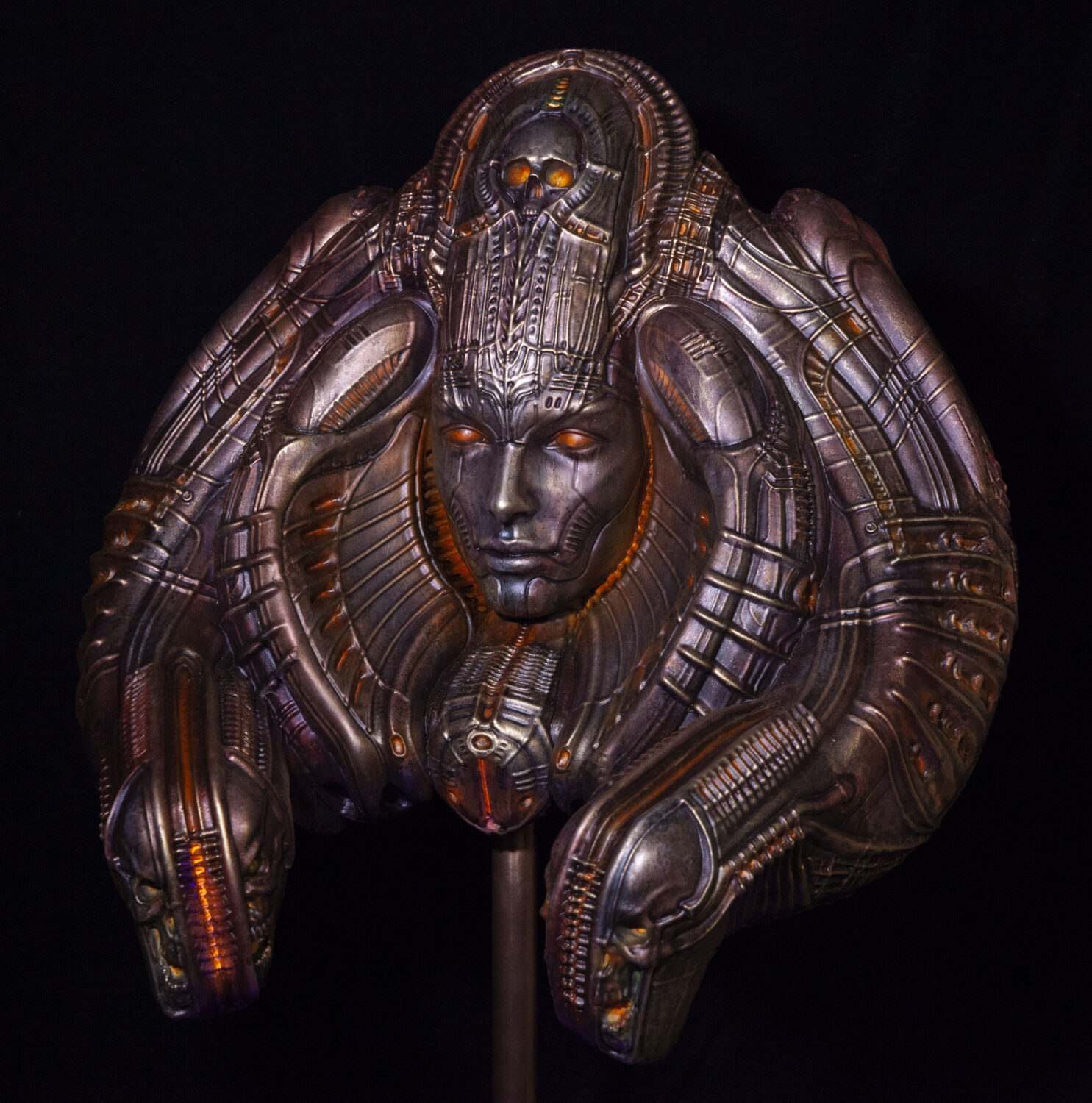 Jason Hite's largest digital sculpture fully realized in cast urethane resin. This piece was created using modern digital sculpting techniques in a program called Zbrush. Once complete, the sculpture was printed in 8 pieces on a large format 3D SLA printer. Each part was painstakingly reassembled. From there all the seams had to be filled, and removed. The print material is not long lasting, prompting Jason to make a complex matrix mold from the print to create this very durable urethane resin cast. This is the first of only three castings that will be made. Size is 19" x 16" x 10" on a 15" round wood base and copper stand. Total height with stand is about 25" tall.