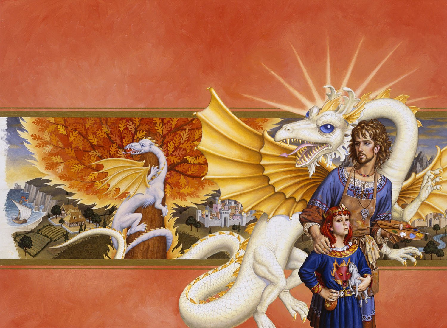 Oils, ink, gold paint on board, 10/97, 19.25 x 26 inches, signed left of tree trunk. For the second novel in the Branion Series by Fiona Patton. How nice to have a hero who is an artist! Though he doesn’t do a lot of painting in the story, for there is an imperious little princess to rescue and protect. I enjoyed looking up old medieval frescoes. And the author requested that Simon the Court Painter look like Alan Rickman. I am happy to oblige! This is the second time I used the actor as inspiration for a book character. The first time was for The Legend of Nightfall. I was lucky to see him on Broadway in Les Liaisons Dangereuses and that was unforgettable.
