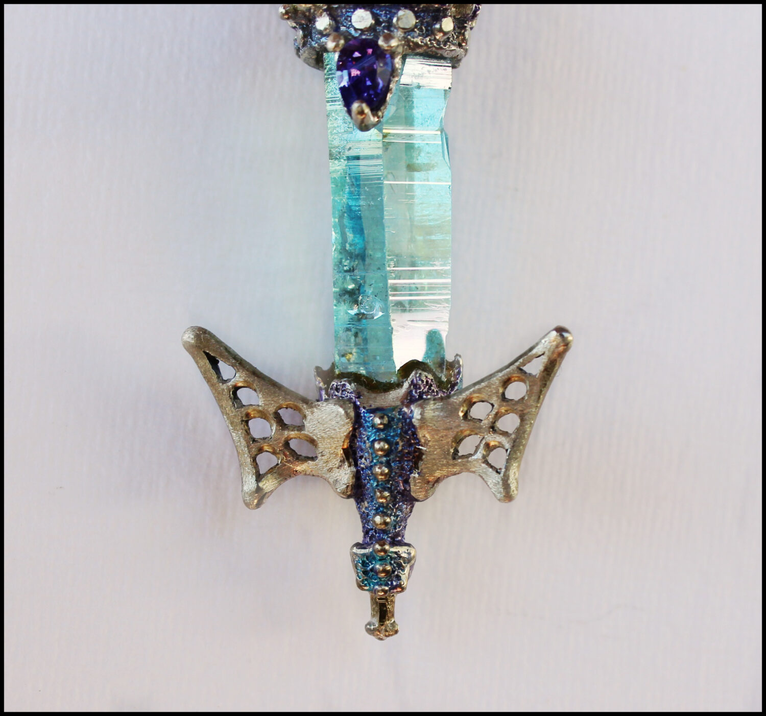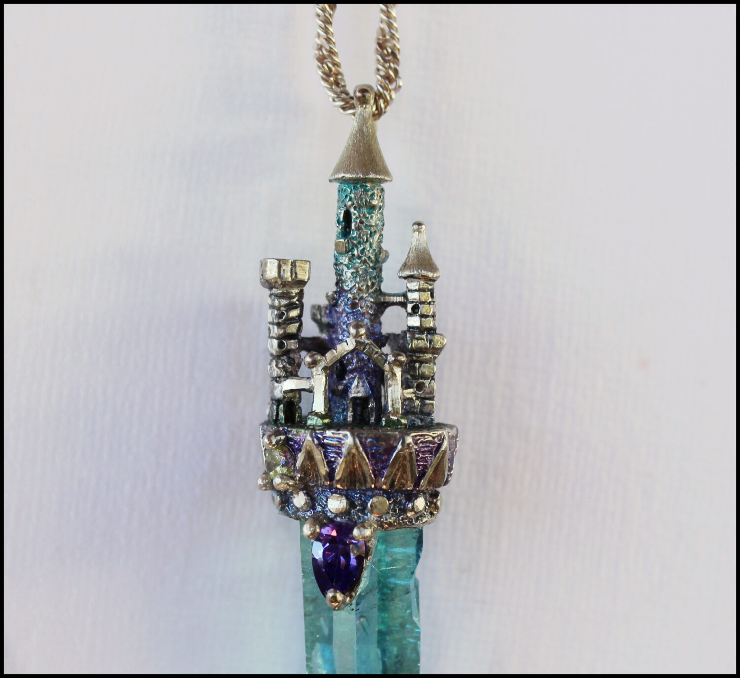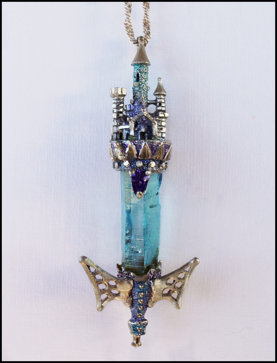 Standing high on a frozen lake is a proud and noble castle, with turrets and keeps... sleeping beneath the water is an ice dragon, not frozen.... just sleeping.This piece is Silver with mixed gemstones and enamels