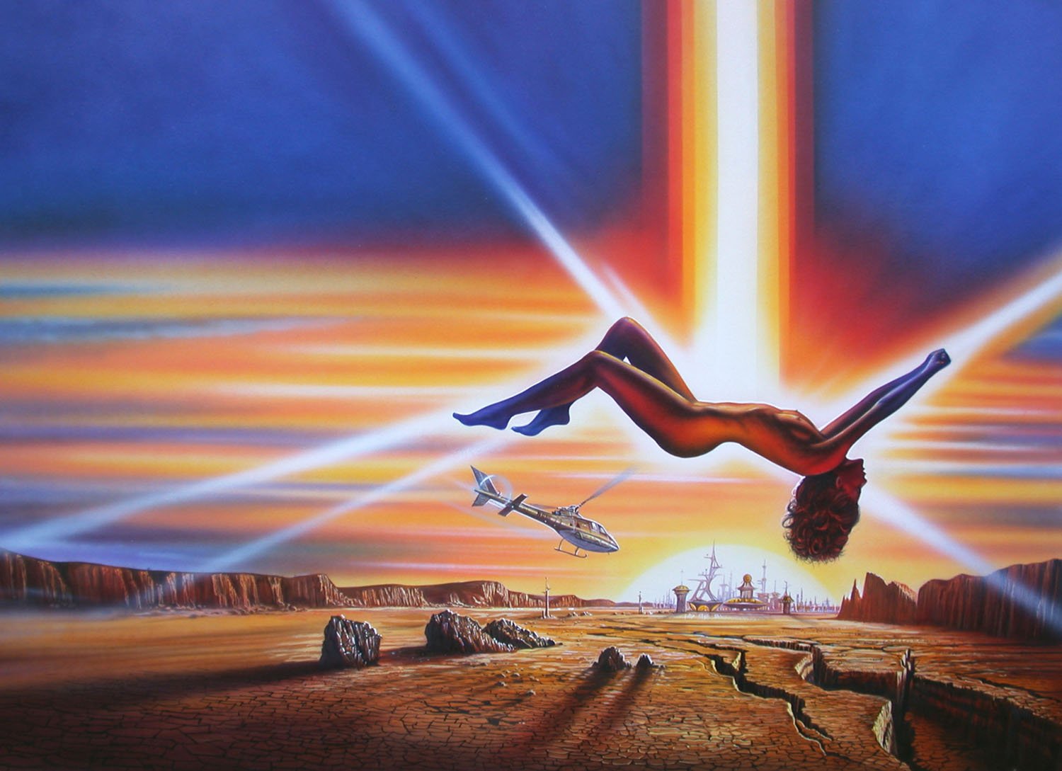 30 x 20 inches, acrylic on board. 1987. Cover for "The Shadow Dancers" (G.O.D. INC No. 2) by Jack L. Chalker, NEL.