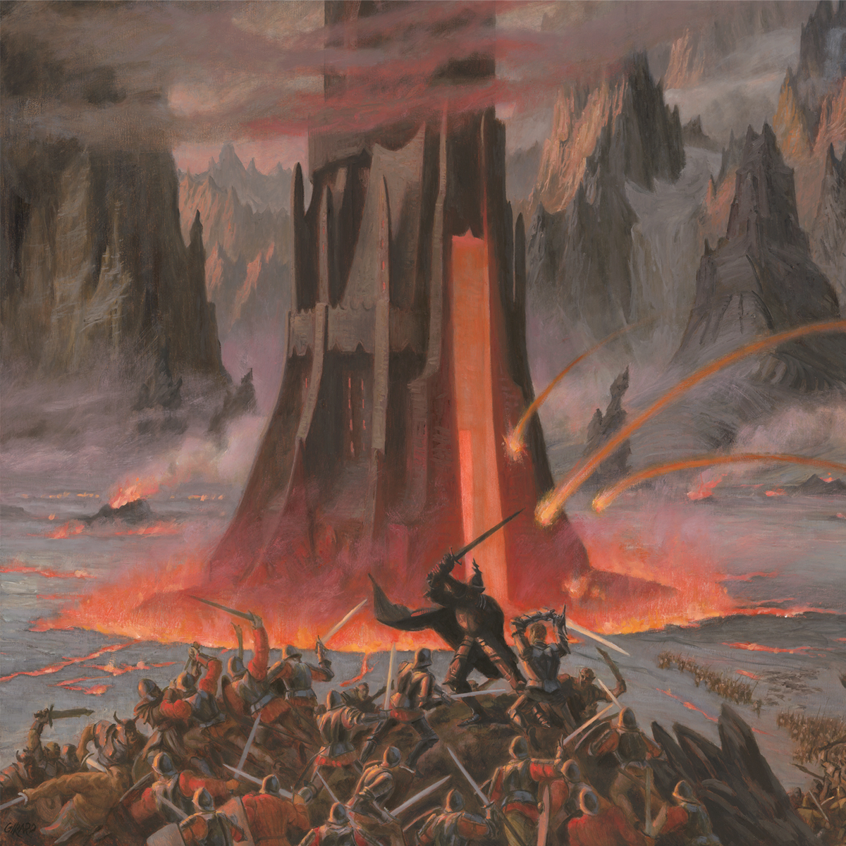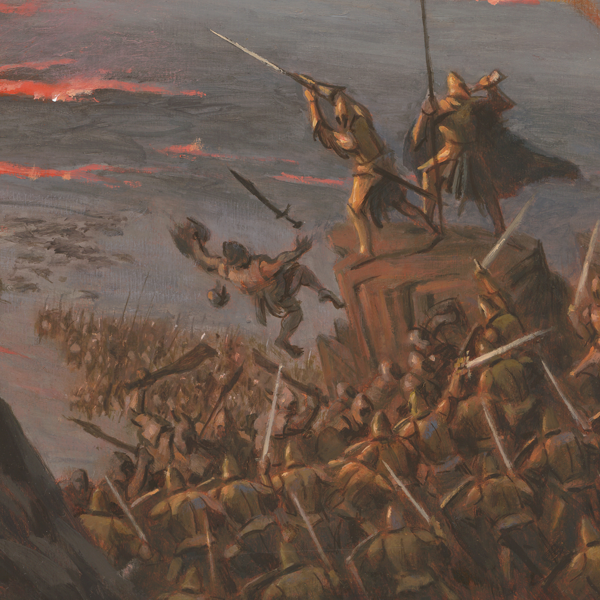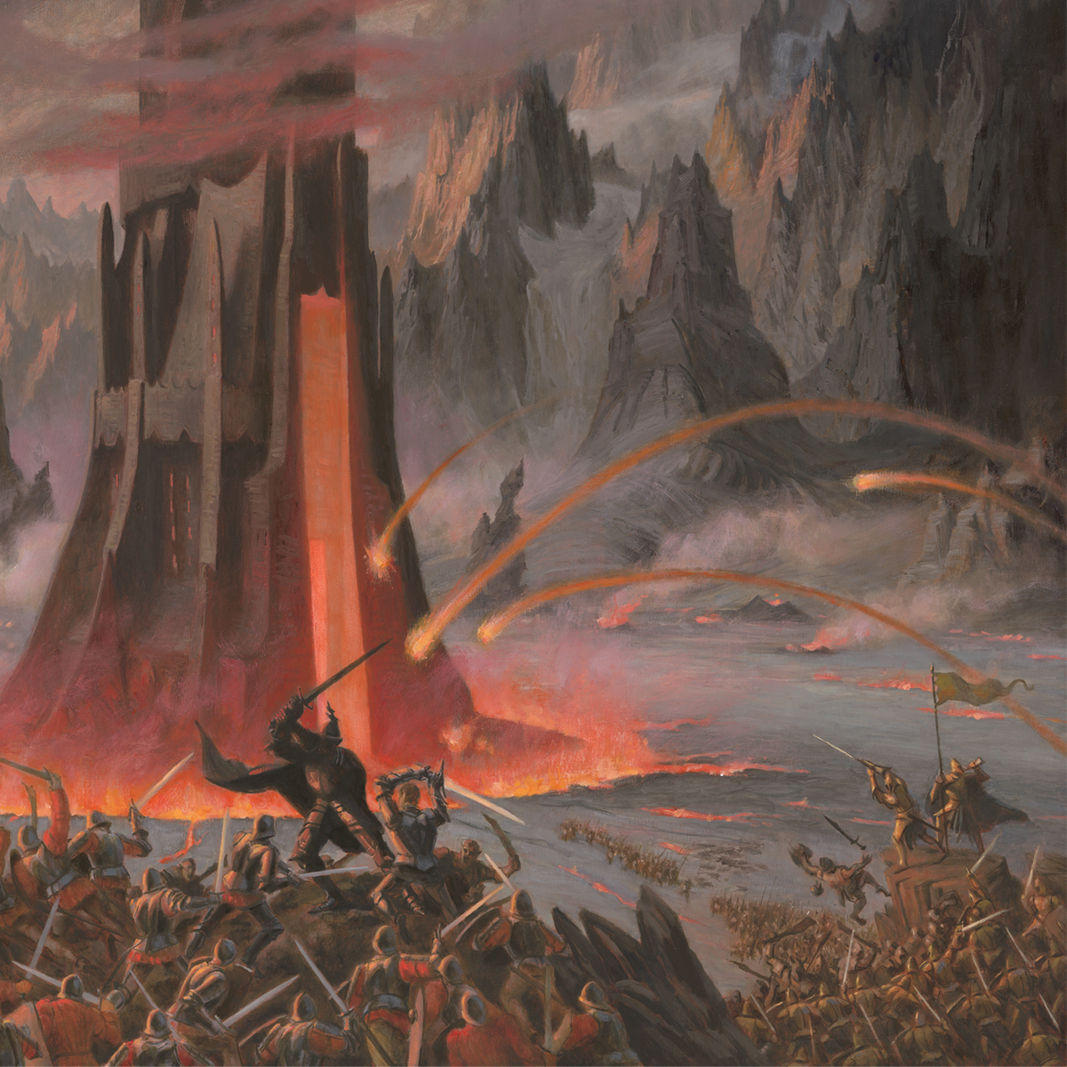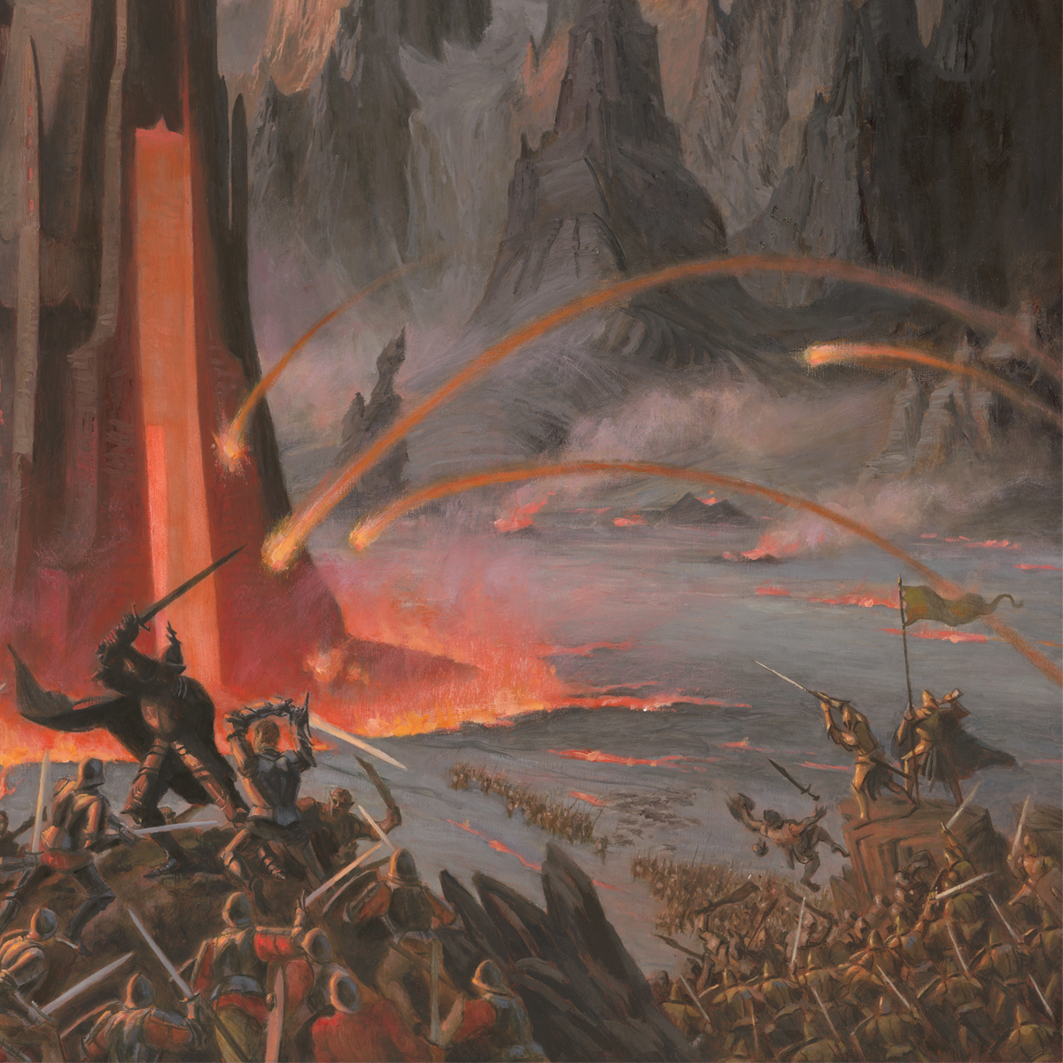 At the siege of Barad-dûr men and elves formed the Last Alliance to confront the evil of the Dark Lord. In the battle, Elendil, the High King of Arnor and Gondor was killed by the Dark Lord Suaron. Elendil's son, Isildur, confronted Suaron, and cut the the One Ring from his finger. Suaron's armies were defeated, and the fortress of Barad-dûr was destroyed. This of course was not the end of the story.In my painting, Sauron has left his fortress and climbed the slopes of Mount Doom to confront the enemy.
