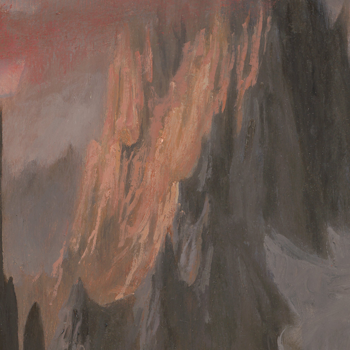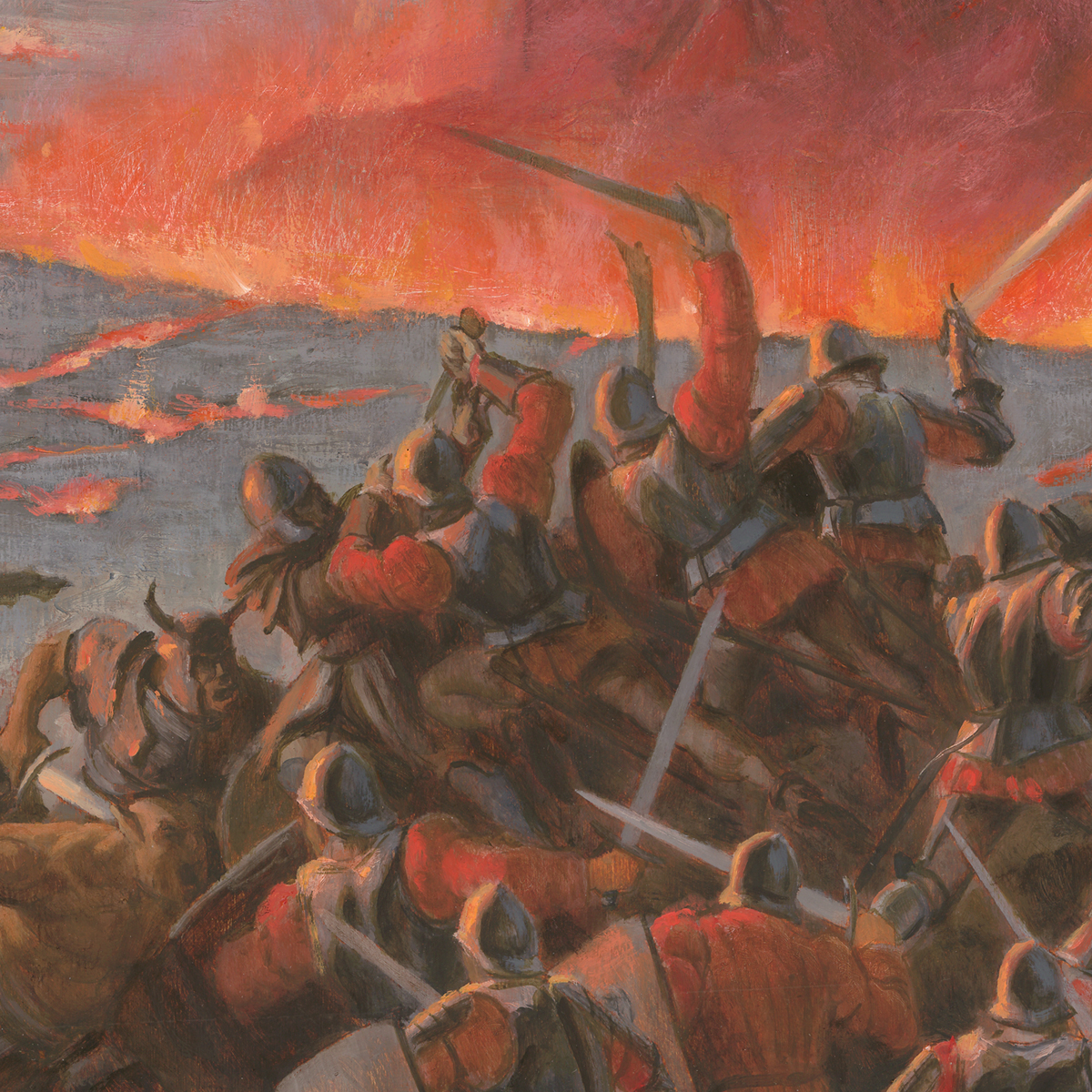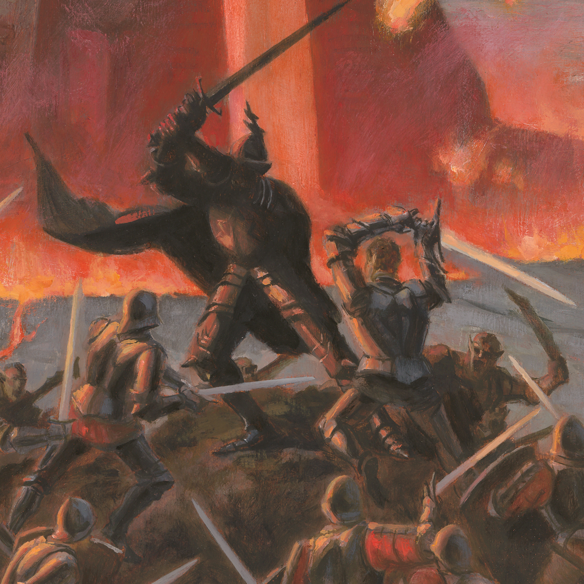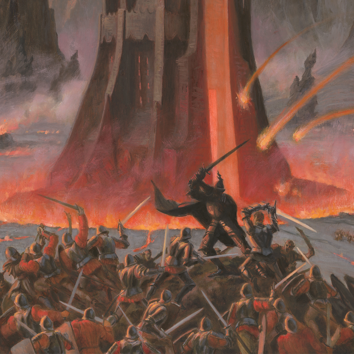 At the siege of Barad-dûr men and elves formed the Last Alliance to confront the evil of the Dark Lord. In the battle, Elendil, the High King of Arnor and Gondor was killed by the Dark Lord Suaron. Elendil's son, Isildur, confronted Suaron, and cut the the One Ring from his finger. Suaron's armies were defeated, and the fortress of Barad-dûr was destroyed. This of course was not the end of the story.In my painting, Sauron has left his fortress and climbed the slopes of Mount Doom to confront the enemy.