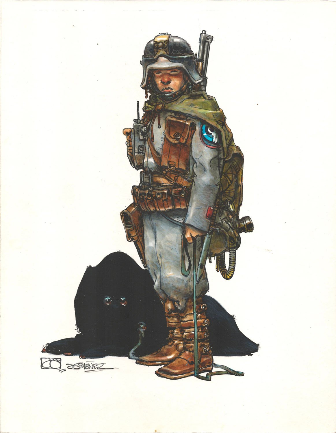 12.9 x 9.8 inches, watercolor and acrylic on paper. Concept color study for The Soldier character
