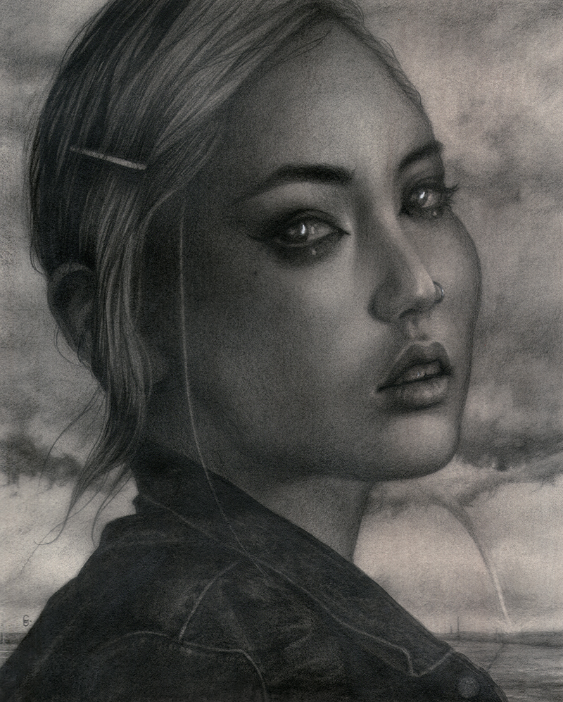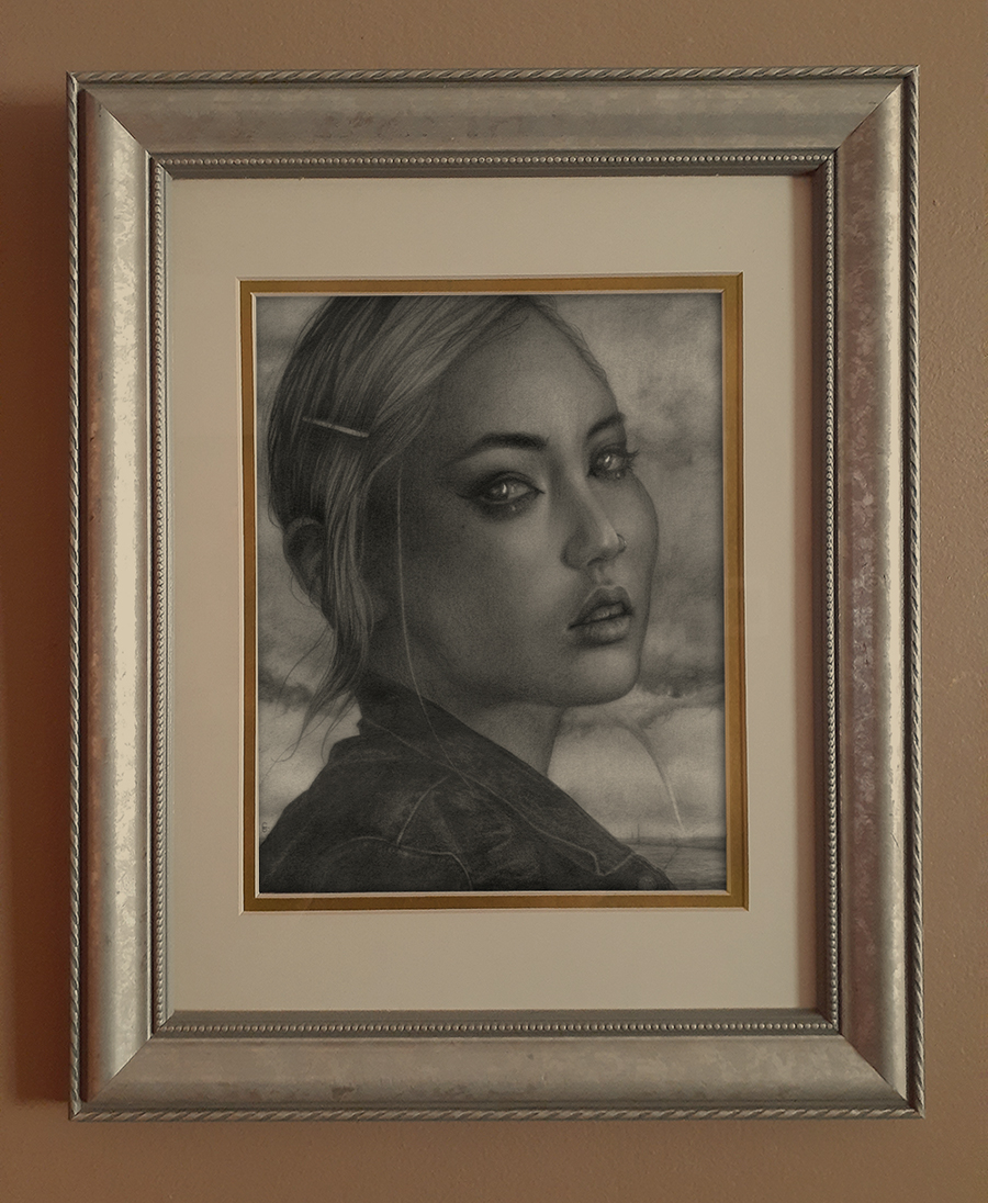 Graphite on paper over an iridescent watercolor wash, framed to 14" x 16"