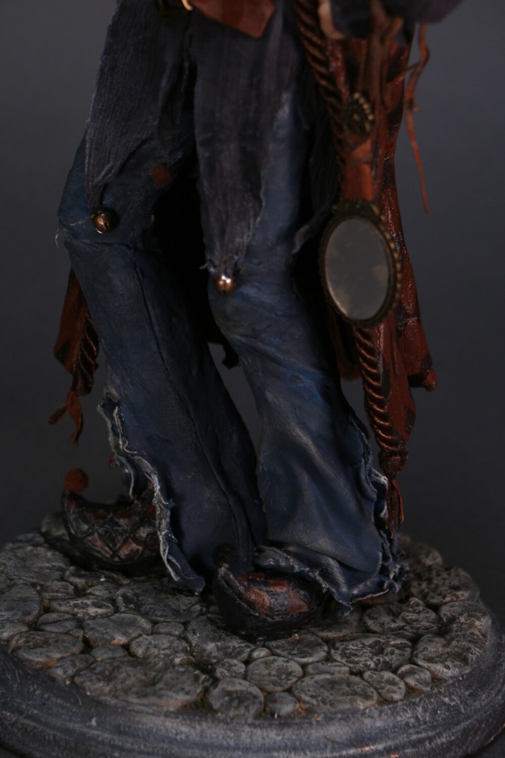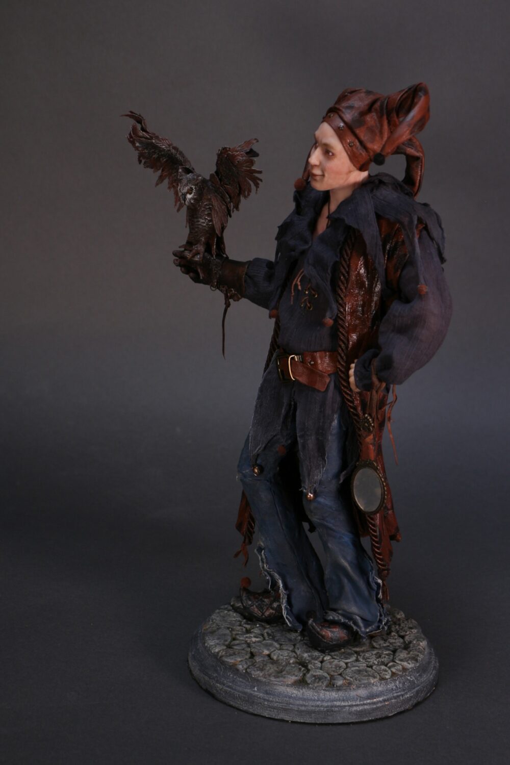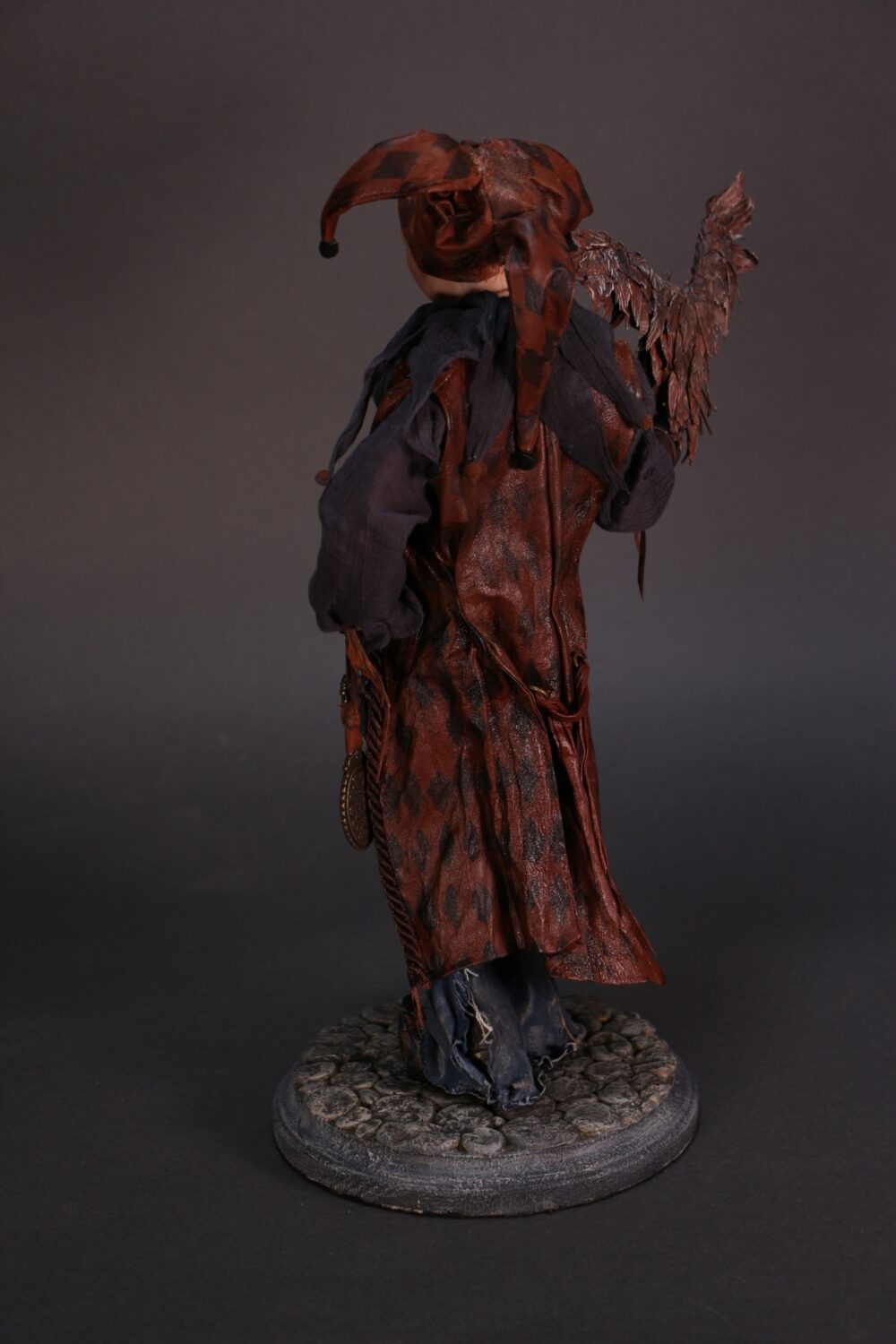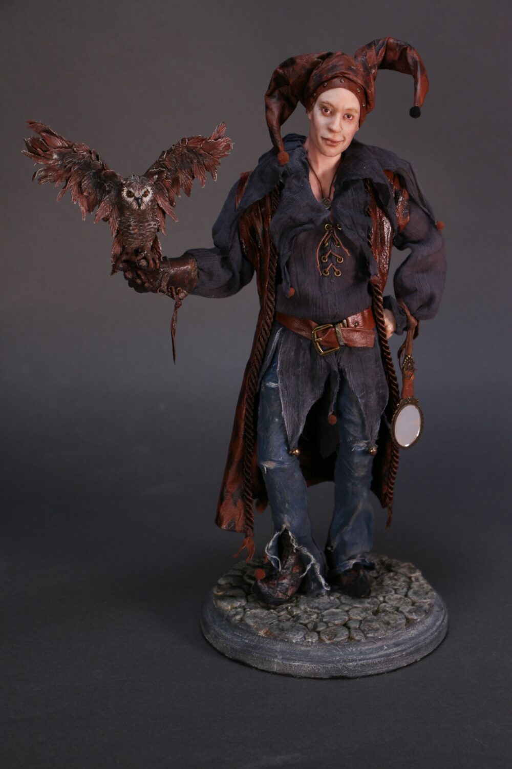 This OOAK (one-of-a-kind) piece was inspired by the European character, Till Eulenspiegel. It is hand-sculpted from polymer clay over a wire armature and costumed with hand-dyed fabrics and feathers.The overall measurement is 15 x 10 inches.