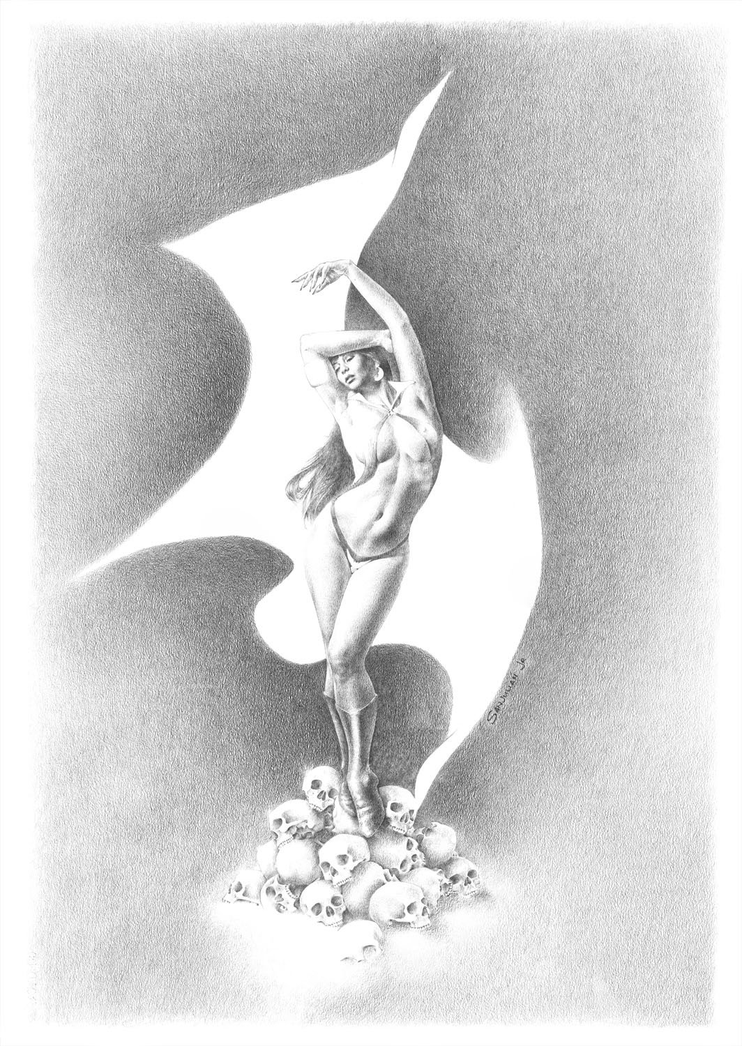 27 x 40 inches, pencil on paper. 2020. This is a work by Manuel Sanjulian, Jr., the son of the famed Spanish illustrator.