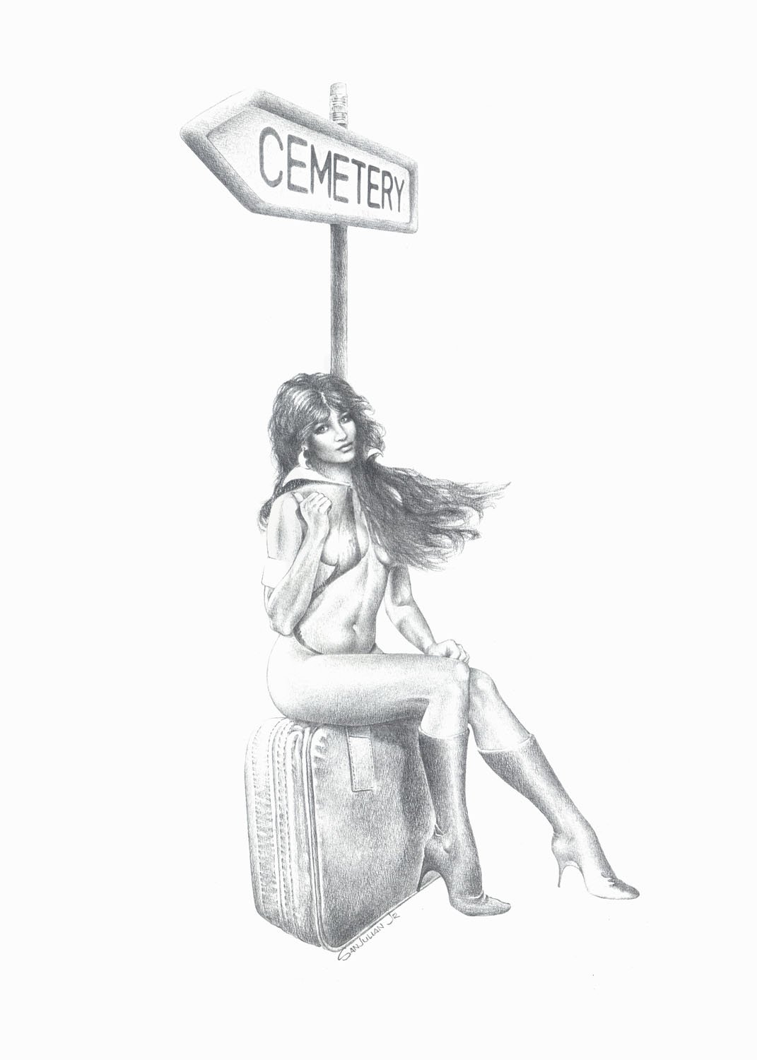 20 x 27 inches, pencil on paper. 2019. This is a work by Manuel Sanjulian, Jr., the son of the famed Spanish illustrator.
