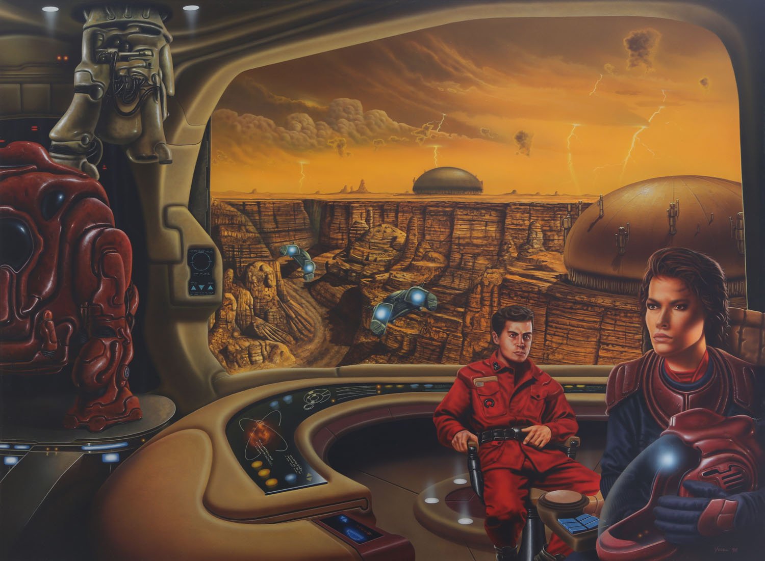 40 x 30 inches, acrylic on gessoed illustration board. 1988. Published by Corgi UK Author Pamela Sargent This piece is a collaboration between Paul Youll and Stephen Youll.