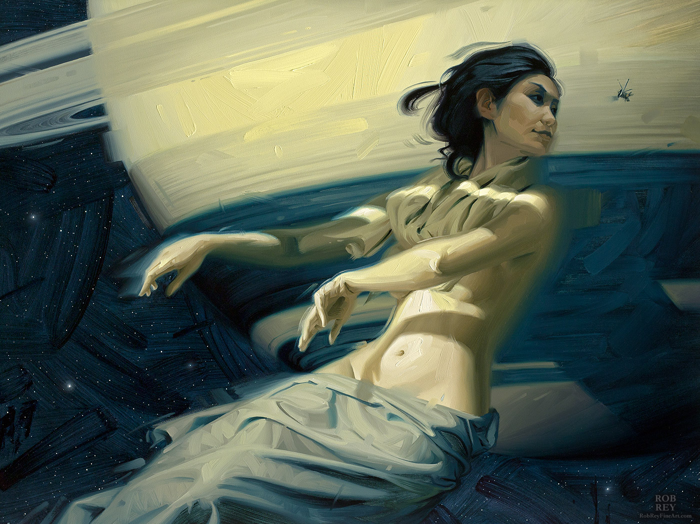The focus of this painting is the spirit of discovery, depicting Saturn, the Cassini space probe, and an allegorical figure of scientific truths yet to be discovered.