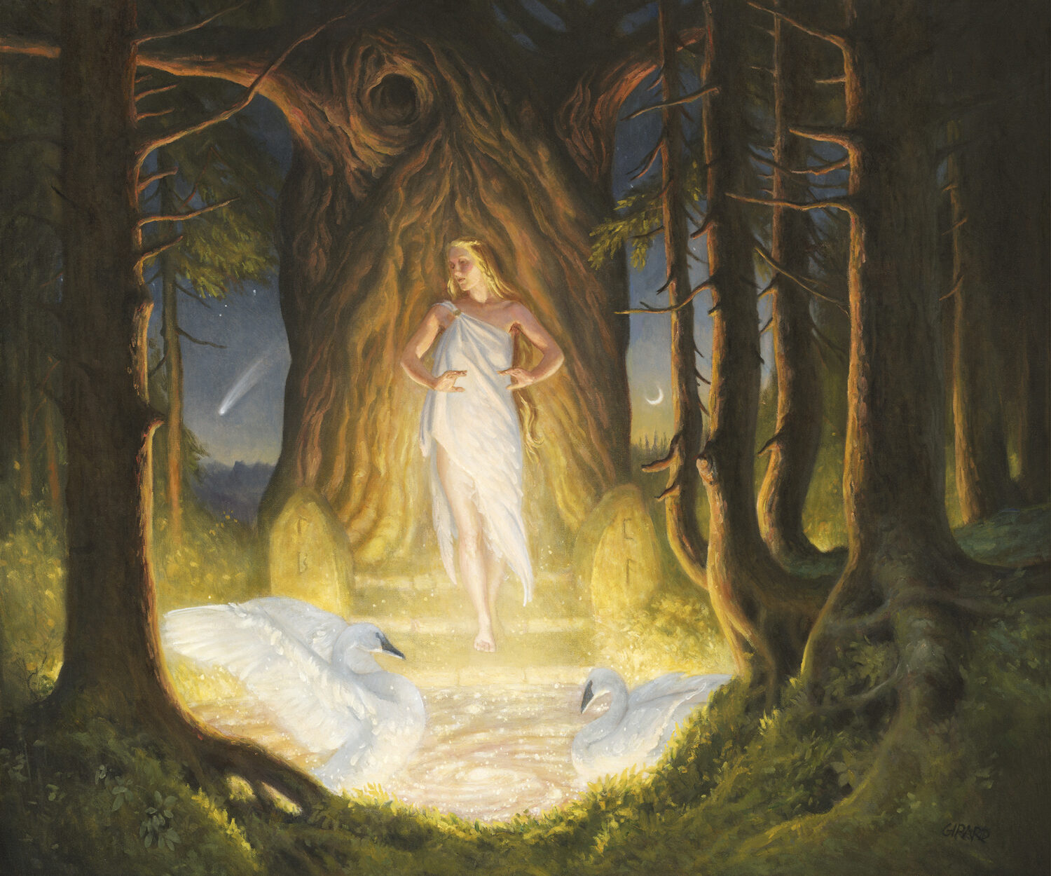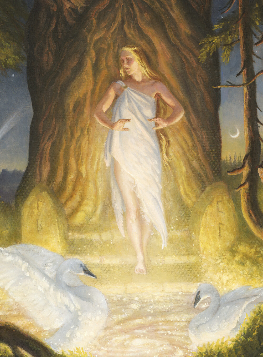 Deep in the forest is a great tree. At the roots of the tree is a well, the Well of Memory. Three Norns (goddesses of fate) take council at the well and nourish the World Tree. The well rejuvenates, and whoever bathes in its water, leaves it as a being of bright shining light. The Norns are shapeshifters and can transform themselves into swans and then back again into human form.