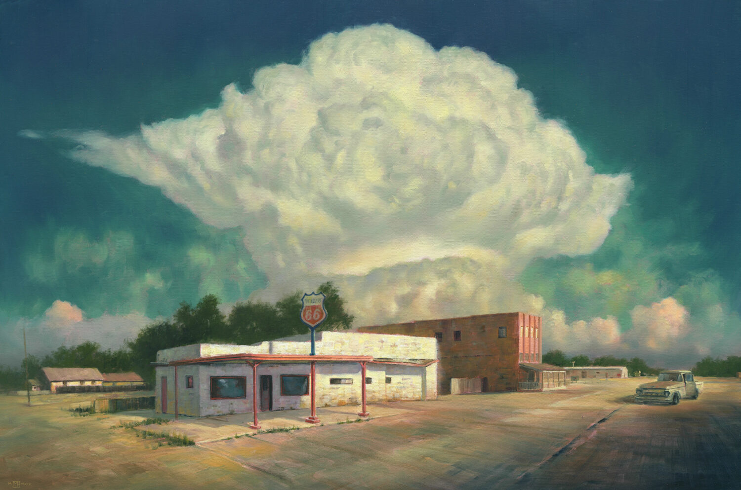 An apocalyptic cloud over a corner of a small town in Texas on Route 66 called Whiteface.