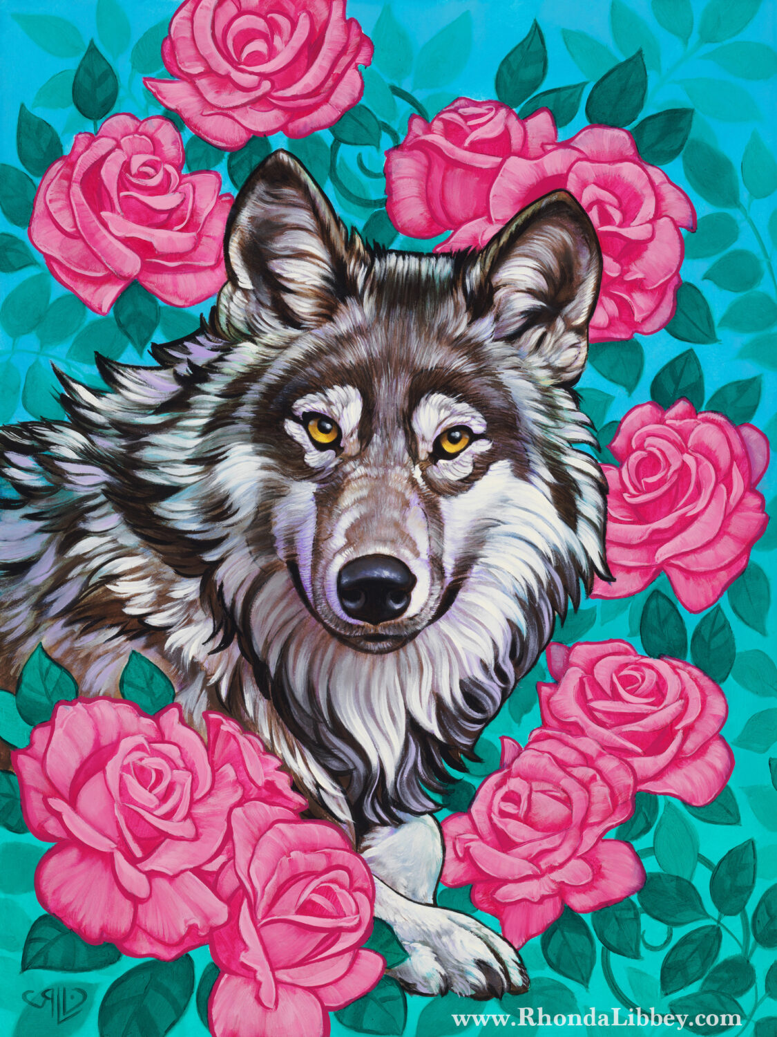 Wolf with Roses is a personal piece I created in 2025. It is oil on ampersand panel.