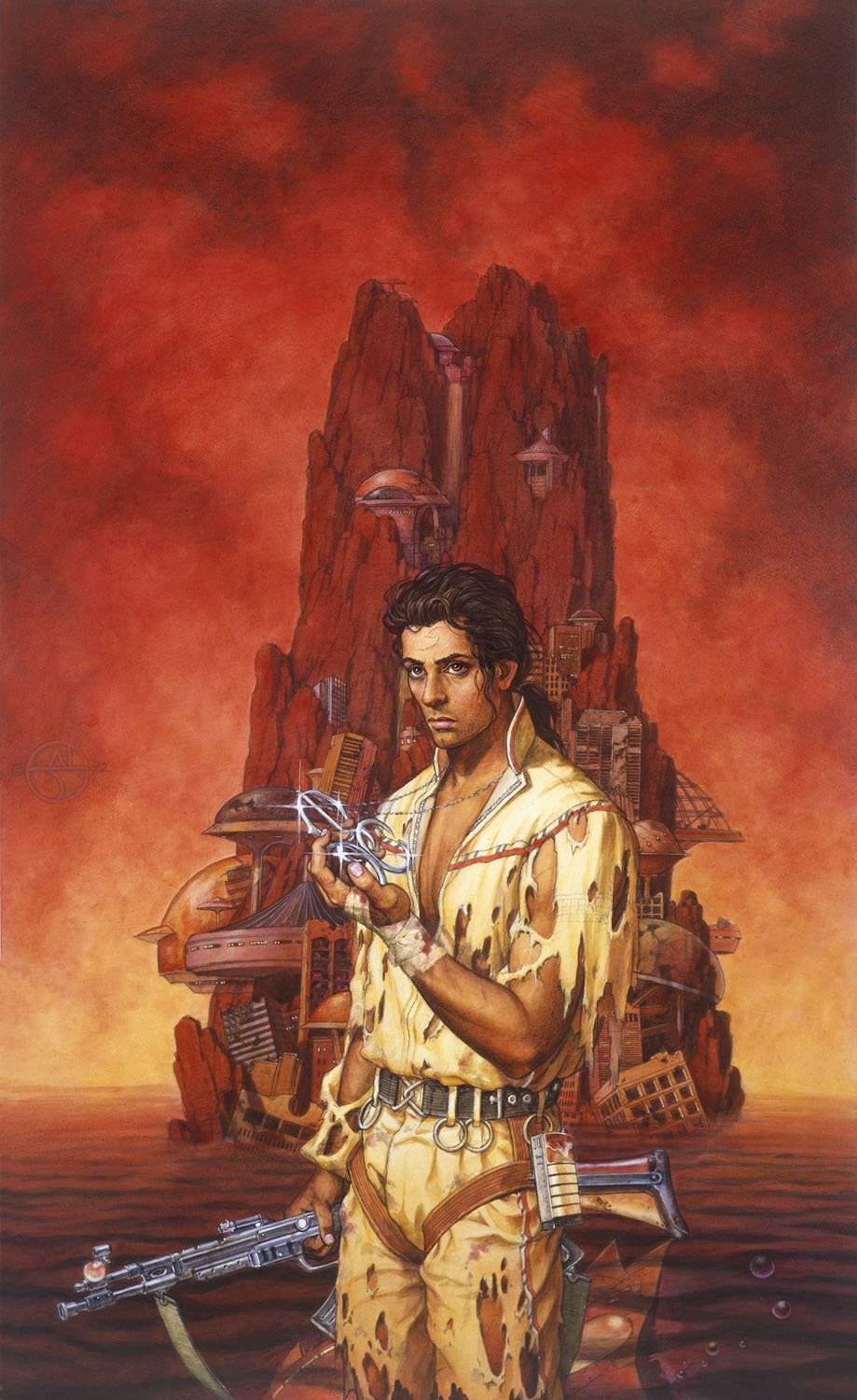 Acrylics on board, 7/92, 25 x 18 inches, signed middle left. For the novel by Joan D. Vinge. In this sequel to the Hugo award-winning “The Snow Queen”, former policeman BZ Gundhalinu goes to help his brothers prospect on the wretched planet of World’s End. I rarely get to do a science fiction cover, but I think this turned out pretty nice. I still wish I could do a great fade away landscape like that master, Michael Whelan. The actor George Chakiris was my inspiration for BZ.